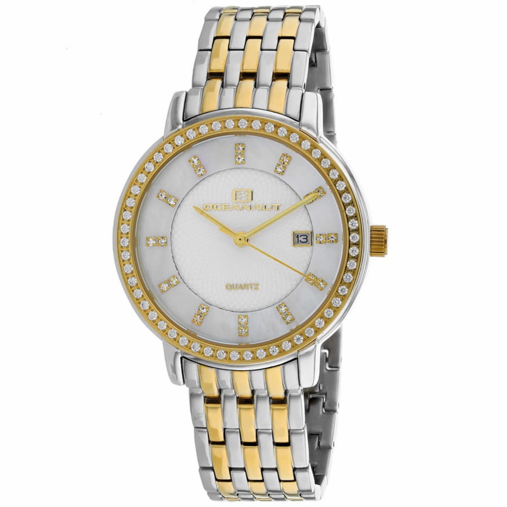 Silver-tone stainless steel case with a two-tone (silver-tone and yellow gold-tone) stainless steel bracelet. Fixed yellow gold-tone stainless steel bezel. Mother of pearl dial with yellow gold-tone hands and index hour markers. Dial Type: Analog. Date display at the 3 o'clock position. Quartz movement. Scratch resistant mineral crystal. Round case shape, case size: 40 mm, case thickness: 10 mm. Band width: 18 mm, band length: 7.5 inches. Fold over clasp with a safety release. Water resistant at 3 meters / 10 feet. Functions: date, hour, minute, second. Blossom Series. Fashion watch style. Oceanaut Blossom Mother of Pearl Dial Ladies Watch OC0011.