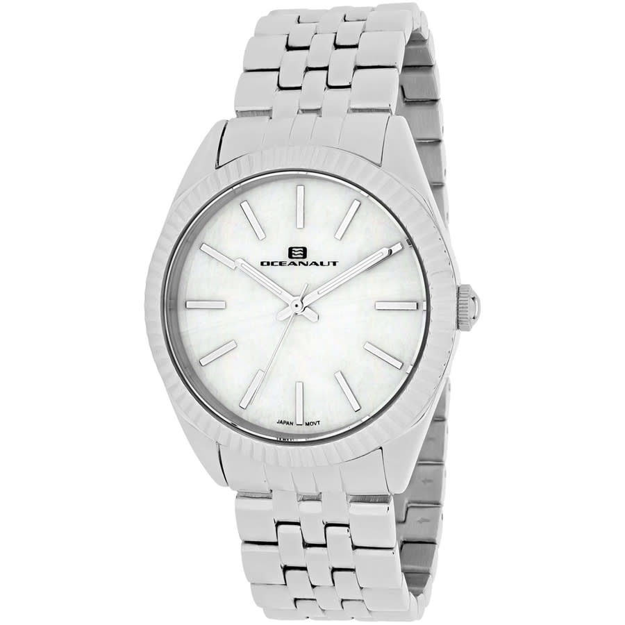 Silver-tone stainless steel case and bracelet. Fixed silver-tone stainless steel bezel. Mother of pearl dial with silver-tone hands and index hour markers. Dial Type: Analog. Quartz movement. Scratch resistant mineral crystal. Round case shape, case size: 38 mm. Band width: 18 mm. Jewelry clasp. Water resistant at 30 meters / 100 feet. Functions: hour, minute, second. Chique Series. Fashion watch style. Watch label: Japan Movt. Oceanaut Chique Quartz Ladies Watch OC7410.