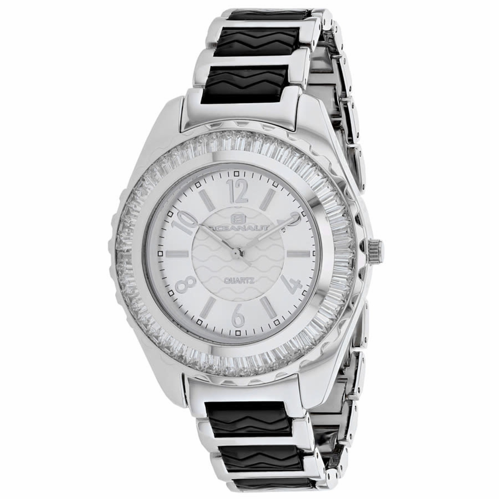 Silver-tone stainless steel case with a two-tone (black and silver-tone) stainless steel bracelet. Silver-tone stainless steel bezel. Silver-tone dial with silver-tone hands and Arabic numeral hour markers. Minute markers around the outer rim. Dial Type: Analog. Luminescent hands and markers. Quartz movement. Scratch resistant mineral crystal. Round case shape, case size: 40 mm, case thickness: 12 mm. Band width: 18 mm, band length: 7.5 inches. Fold over clasp with a safety release. Water resistant at 3 meters / 10 feet. Functions: hour, minute, second. Lucia Series. Fashion watch style. Oceanaut Lucia Silver-tone Dial Ladies Watch OC0540.