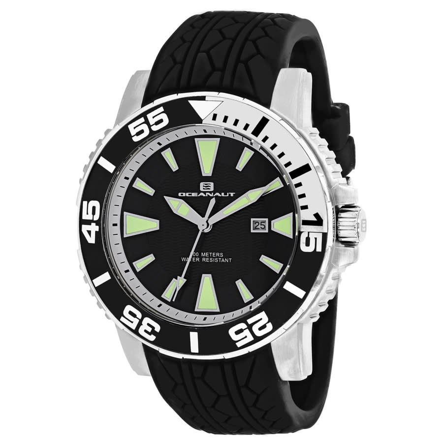 Silver-tone stainless steel case with a black silicone strap. Fixed black stainless steel bezel. Black dial with silver-tone hands and index hour markers. Minute markers around the outer rim. Dial Type: Analog. Luminescent hands and markers. Date display at the 3 o'clock position. Quartz movement. Scratch resistant mineral crystal. Round case shape, case size: 48 mm. Band width: 22 mm. Buckle clasp. Water resistant at 200 meters / 660 feet. Functions: date, hour, minute, second. Marletta Series. Fashion watch style. Oceanaut Marletta Quartz Black Dial Mens Watch OC2916.