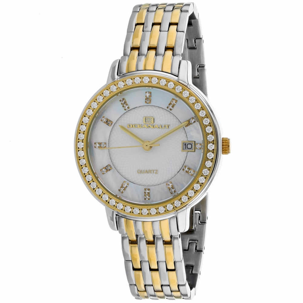 Silver-tone stainless steel case with a two-tone (silver-tone and yellow gold-tone) stainless steel bracelet. Fixed yellow gold-tone stainless steel bezel. Mother of pearl dial with yellow gold-tone hands and index hour markers. Dial Type: Analog. Date display at the 3 o'clock position. Quartz movement. Scratch resistant mineral crystal. Round case shape, case size: 35 mm, case thickness: 10 mm. Band width: 14 mm, band length: 7.5 inches. Fold over clasp with a safety release. Water resistant at 3 meters / 10 feet. Functions: date, hour, minute, second. Mini Blossom Series. Fashion watch style. Oceanaut Mini Blossom Mother of Pearl Dial Ladies Watch OC0021.