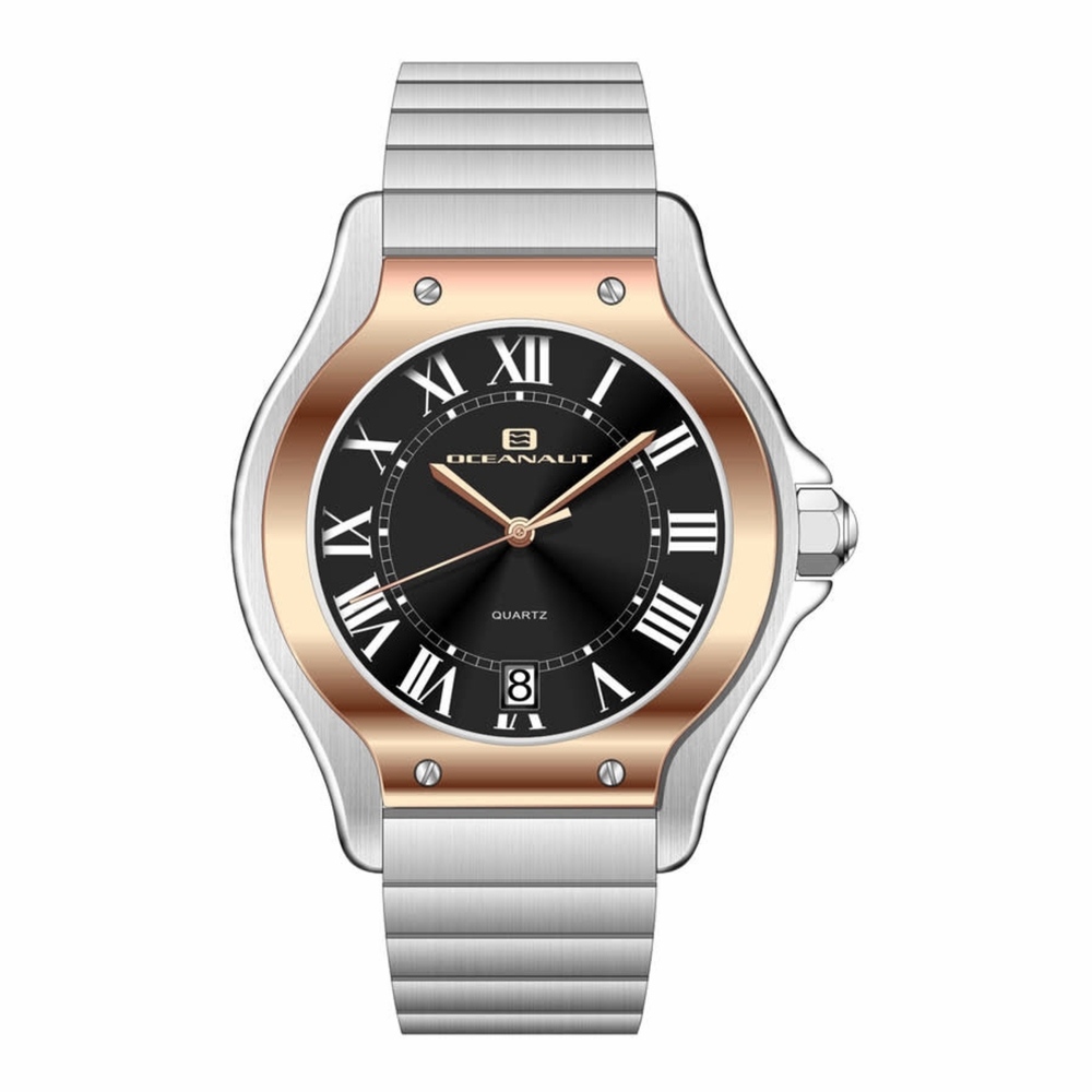 Silver-tone stainless steel case and bracelet. Fixed rose gold-tone stainless steel bezel. Black dial with rose gold-tone hands and Roman numeral hour markers. Minute markers around the outer rim. Dial Type: Analog. Date display at the 6 o'clock position. Quartz movement. Scratch resistant mineral crystal. Round case shape, case size: 35 mm, case thickness: 12 mm. Band width: 16 mm, band length: 7.5 inches. Fold over clasp with a safety release. Water resistant at 50 meters / 165 feet. Functions: date, hour, minute, second. Rayonner Series. Fashion watch style. Oceanaut Rayonner Black Dial Ladies Watch OC1299.