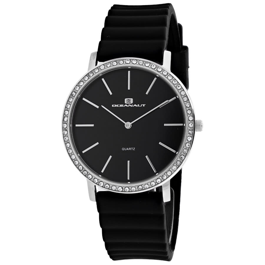 Silver-tone stainless steel case with a black rubber strap. Fixed silver-tone stainless steel bezel. Black dial with silver-tone hands and index hour markers. Dial Type: Analog. Quartz movement. Scratch resistant mineral crystal. Round case shape, case size: 40 mm. Band width: 20 mm. Buckle clasp. Water resistant at 30 meters / 100 feet. Functions: hour, minute. Ripple Series. Fashion watch style. Oceanaut Ripple Quartz Black Dial Ladies Watch OC0261.
