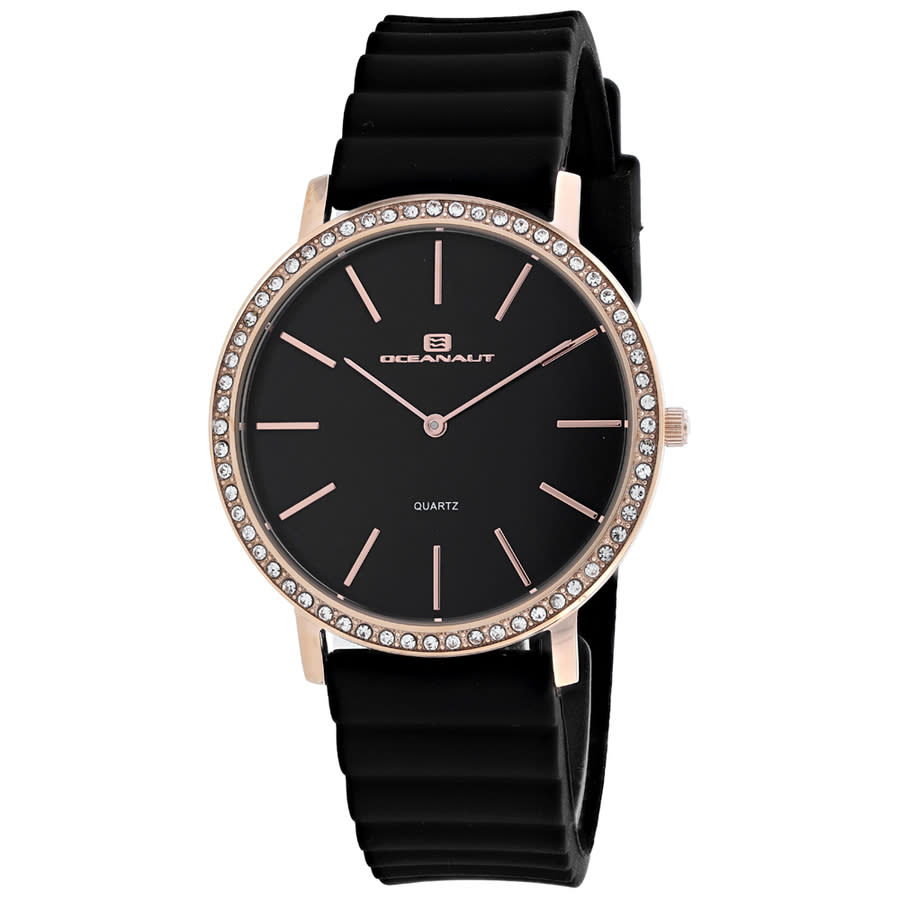 Rose gold-tone stainless steel case with a black rubber strap. Fixed rose gold-tone stainless steel bezel. Black dial with rose gold-tone hands and index hour markers. Dial Type: Analog. Quartz movement. Scratch resistant mineral crystal. Round case shape, case size: 40 mm. Band width: 20 mm. Buckle clasp. Water resistant at 30 meters / 100 feet. Functions: hour, minute. Ripple Series. Fashion watch style. Oceanaut Ripple Quartz Black Dial Ladies Watch OC0265.