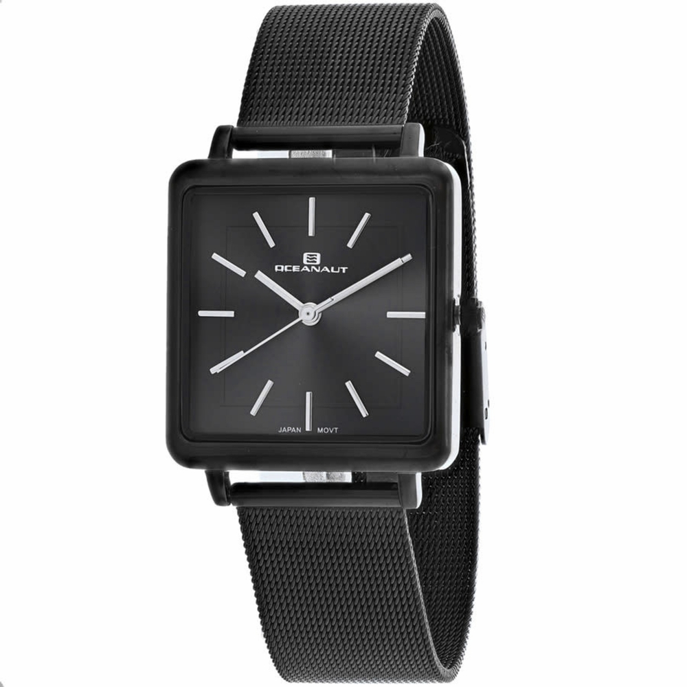 Black stainless steel case and bracelet. Fixed black stainless steel bezel. Black dial with silver-tone hands and index hour markers. Dial Type: Analog. Quartz movement. Scratch resistant mineral crystal. Square case shape, case size: 30 mm, case thickness: 8 mm. Band width: 18 mm, band length: 7.5 inches. Fold over clasp with a safety release. Water resistant at 3 meters / 10 feet. Functions: hour, minute, second. Traditional Series. Fashion watch style. Watch label: Japan Movt. Oceanaut Traditional Black Dial Ladies Watch OC0289.