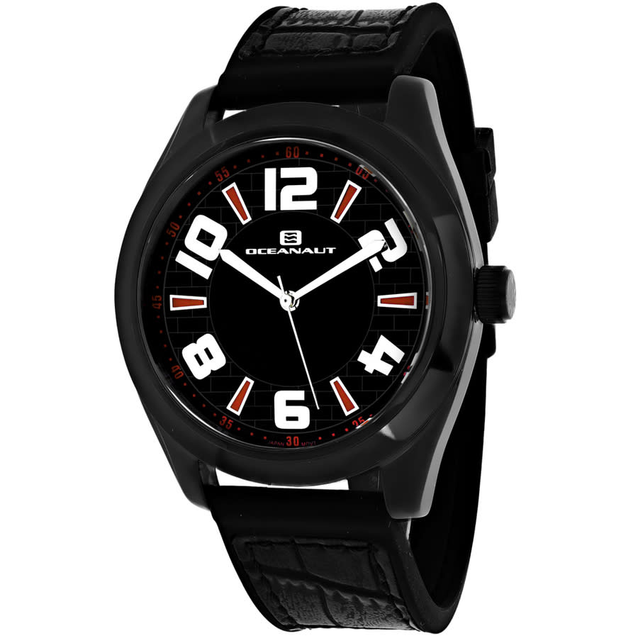 Black stainless steel case with a black silicone strap. Fixed black stainless steel bezel. Black dial with silver-tone hands and index hour markers. Minute markers around the outer rim. Dial Type: Analog. Quartz movement. Scratch resistant mineral crystal. Round case shape, case size: 44 mm. Band width: 20 mm. Buckle clasp. Water resistant at 30 meters / 100 feet. Functions: hour, minute, second. Vault Series. Fashion watch style. Oceanaut Vault Quartz Black Dial Mens Watch OC7511.