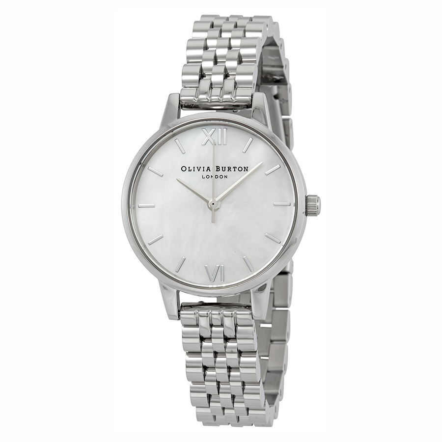 Silver-tone stainless steel case with a silver-tone stainless steel bracelet. Fixed silver-tone stainless steel bezel. Mother of pearl dial with silver-tone hands and Roman numeral and index hour markers. Dial Type: Analog. Quartz movement. Scratch resistant mineral crystal. Pull / push crown. Solid case back. Round case shape, case size: 30 mm, case thickness: 8 mm. Deployment with push button release clasp. Water resistant at 10 meters / 33 feet. Functions: hour, minute, second. Casual watch style. Watch label: Japan Movt. Olivia Burton Midi Mother of Pearl Dial Ladies Watch OB16MOP02.