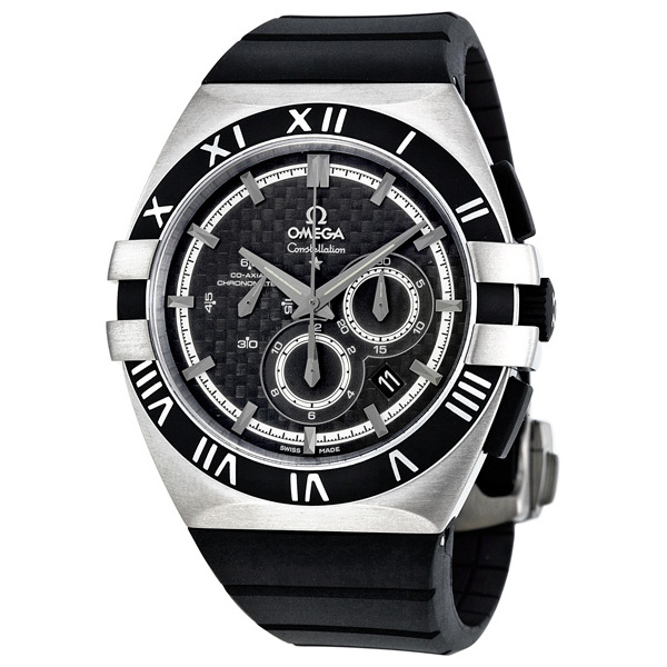 Titanium case with a black rubber strap. Fixed blackbezel. Black dial with luminous silver-tone hands and stick hour markers. Minute markers around the outer rim. Dial Type: Analog. Date displays between the 4 and 5 o'clock position. Chronograph - three sub-dials displaying: 12 hours, 30 minutes and 60 seconds. Self winding automatic chronometer movement. Scratch resistant sapphire crystal. Solid case back. Case diameter: 41 mm. Round case shape. Push button deployment clasp. Water resistant at 100 meters (330 feet). Functions: hours, minutes, seconds, date, chronograph. Luxury watch style. Watch label: Swiss Made. Omega Constellation Double Eagle Mission Hills World Cup Watch 121.92.41.50.01.001.