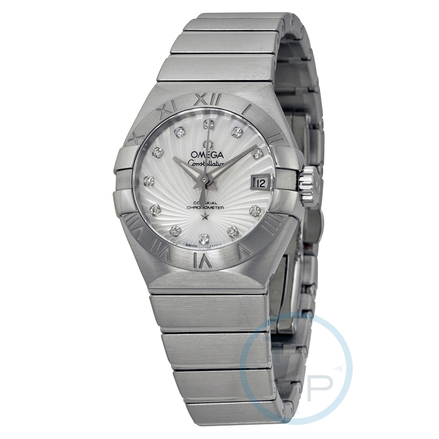 Stainless steel case with a stainless steel bracelet. Fixed stainless steel bezel. White mother of pearl dial with luminous silver-tone hands and diamond hour markers. Dial Type: Analog. Luminescent hands. Date display at the 3 o'clock position. Automatic movement with a 50 hour power reserve. Scratch resistant sapphire crystal. Pull / push crown. Skeleton case back. Case diameter: 27 mm. Round case shape. Fold over clasp with a safety release. Water resistant at 100 meters / 330 feet. Functions: date, hour, minute, second. Luxury watch style. Watch label: Swiss Made. Omega Constellation White Mother of Pearl Steel Ladies Watch 123.10.27.20.55.001.
