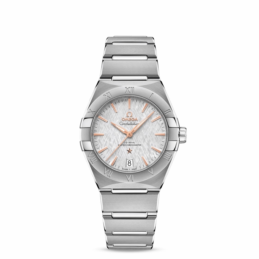 Stainless steel case and bracelet. Fixed stainless steel bezel. Grey dial with rose gold-tone hands and index hour markers. Dial Type: Analog. Date display at the 6 o'clock position. Omega Calibre 8800 Automatic movement, containing 35 Jewels, bitting at 25200 vph, and has a power reserve of approximately 55 hours. Scratch resistant sapphire crystal. Pull / push crown. Transparent see through case back. Round case shape, case size: 36 mm. Band width: 22.2 mm. Push button folding clasp. Water resistant at 50 meters / 165 feet. Functions: date, hour, minute, second. Constellation Automatic Series. Luxury watch style. Watch label: Swiss Made. Omega Constellation Automatic Grey Dial Ladies Watch 13110362006001.