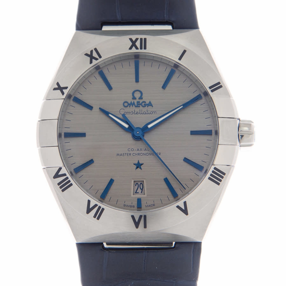 Stainless steel case with a blue (alligator) leather strap. Fixed stainless steel bezel. Grey dial with luminous blue hands and index hour markers. Minute markers around the outer rim. Dial Type: Analog. Luminescent hands. Date display at the 6 o'clock position. Omega calibre 8800 automatic movement, containing 35 Jewels, bitting at 25200 vph, and has a power reserve of approximately 55 hours. Scratch resistant sapphire crystal. Screw down crown. Transparent case back. Round case shape. Case size: 39 mm. Band width: 24.2 mm. Deployment clasp. Water resistant at 50 meters / 165 feet. Functions: date, hour, minute, second, co-axial escapement, chronometer, magnetic resistant. Constellation Co-axial Series. Luxury watch style. Watch label: Swiss Made. Omega Constellation Co-Axial Automatic Chronometer Grey Dial Mens Watch 131.13.39.20.06.002.