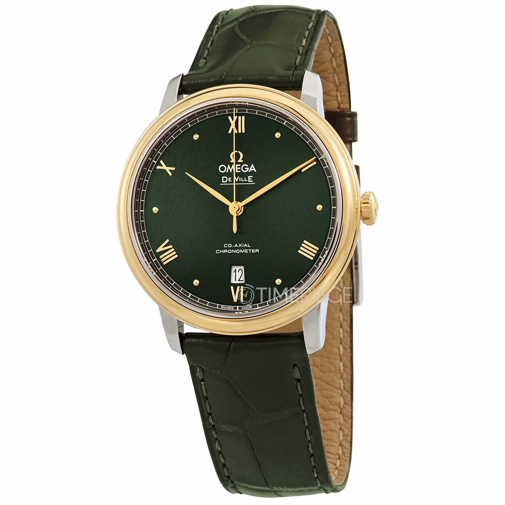 Silver-tone stainless steel case with a green alligator leather strap. Fixed 18kt yellow gold bezel. Green dial with yellow gold-tone hands and Roman numeral-cabochons hour markers. Minute markers around the outer rim. Dial Type: Analog. Date display at the 3 o'clock position. Omega Caliber 2500 Automatic movement, based upon ETA 2892, containing 27 Jewels, bitting at 25200 vph, and has a power reserve of approximately 48 hours. Scratch resistant sapphire crystal. Pull / push crown. Solid case back. Round case shape, case size: 39.5 mm. Band width: 20 mm. Tang clasp. Water resistant at 30 meters / 100 feet. Functions: date, hour, minute, second, co-axial escapement, chronometer, shock resistant. De Ville Series. Luxury watch style. Watch label: Swiss Made. Omega De Ville Automatic Chronometer Green Dial Mens Watch 424.23.40.20.10.001.