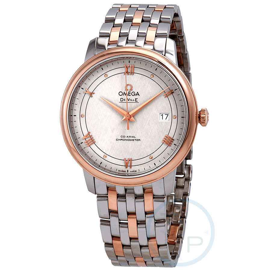 Stainless steel case with a stainless steel bracelet with 18kt rose gold links. Fixed 18kt rose gold bezel. Ivory silvery dial with rose gold-tone dauphine-style hands and alternating Roman numeral and dot hour markers. Minute markers around the outer rim. Dial Type: Analog. Date display at the 3 o'clock position. Omega calibre 2500 automatic movement, based upon ETA 2892-A2, containing 27 Jewels, bitting at 25200 vph, and has a power reserve of approximately 48 hours. Scratch resistant sapphire crystal. Pull / push crown. Solid case back. Round case shape. Case size: 39.5 mm. Band width: 20 mm. Hidden fold over clasp. Water resistant at 30 meters / 100 feet. Functions: date, hour, minute, second, co-axial escapement, chronometer. De Ville Series. Luxury watch style. Watch label: Swiss Made. Omega De Ville Automatic Ivory Silvery Dial Steel and 18kt Rose Gold Watch 424.20.40.20.02.003