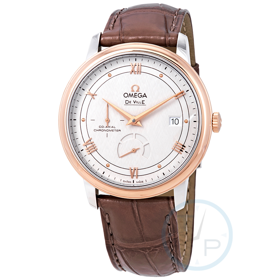 Stainless steel case with a brown leather strap. Fixed 18kt rose gold bezel. Silver dial with rose gold-tone hands and alternating Roman numeral and dot hour markers. Minute markers around the outer rim. Dial Type: Analog. Date display at the 3 o'clock position. Two sub-dials displaying: seconds and power reserve. Omega calibre 2627 automatic movement with a 48-hour power reserve. Scratch resistant sapphire crystal. Pull / push crown. Solid case back. Round case shape. Case size: 39.5 mm. Band width: 20 mm. Tang clasp. Water resistant at 30 meters / 100 feet. Functions: date, hour, minute, second. Luxury watch style. Watch label: Swiss Made. Omega De Ville Prestige Automatic Silver Dial Mens Watch 424.23.40.21.02.001.