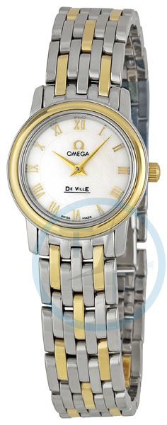 Stainless steel case with a 18kt yellow gold and stainless steel bracelet. Fixed 18kt yellow gold bezel. Mother of pearl dial with gold tone hands and gold tone Roman numerals hour markers. Dial Type: Analog. Luminescent hands and markers. Quartz movement. Scratch resistant sapphire crystal. Gold-tone push / pull crown. Solid case back. Case diameter: 22 mm. Case thickness: 5.7mm. Round case shape. Deployment clasp. Water resistant at 30 meters / 100 feet. Functions: hours, minutes. Dress watch style. Watch label: Swiss Made. Omega DeVille Prestige Ladies Watch 4370.71.
