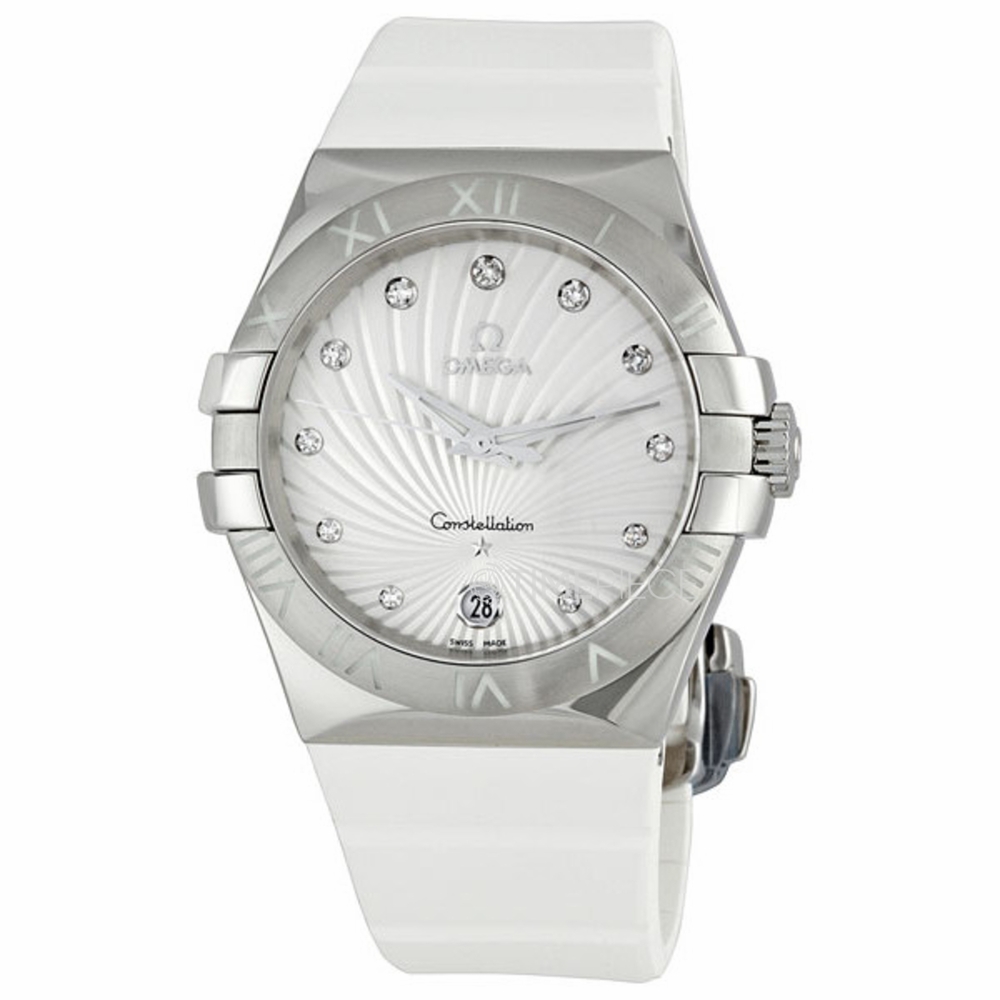 Silver-tone stainless steel case with a white rubber strap. Fixed steel with roman numerals silver-tone stainless steel bezel. White guilloche dial with silver-tone hands and diamond hour markers. Dial Type: Analog. Luminescent hands. Date display at the 6 o'clock position. Omega Calibre 1532 quartz movement. Scratch resistant sapphire crystal. Solid case back. Round case shape, case size: 35 mm. Deployment clasp. Water resistant at 100 meters / 330 feet. Functions: date, hour, minute, second, battery eol indicator. Constellation Series. Sport watch style. Watch label: Swiss Made. Item Variations: 123 12 35 60 52 001, 123-12-35-60-52-001, 123/12/35/60/52/001, 12312356052001. Omega Constellation Quartz Ladies Swiss Watch 123.12.35.60.52.001.
