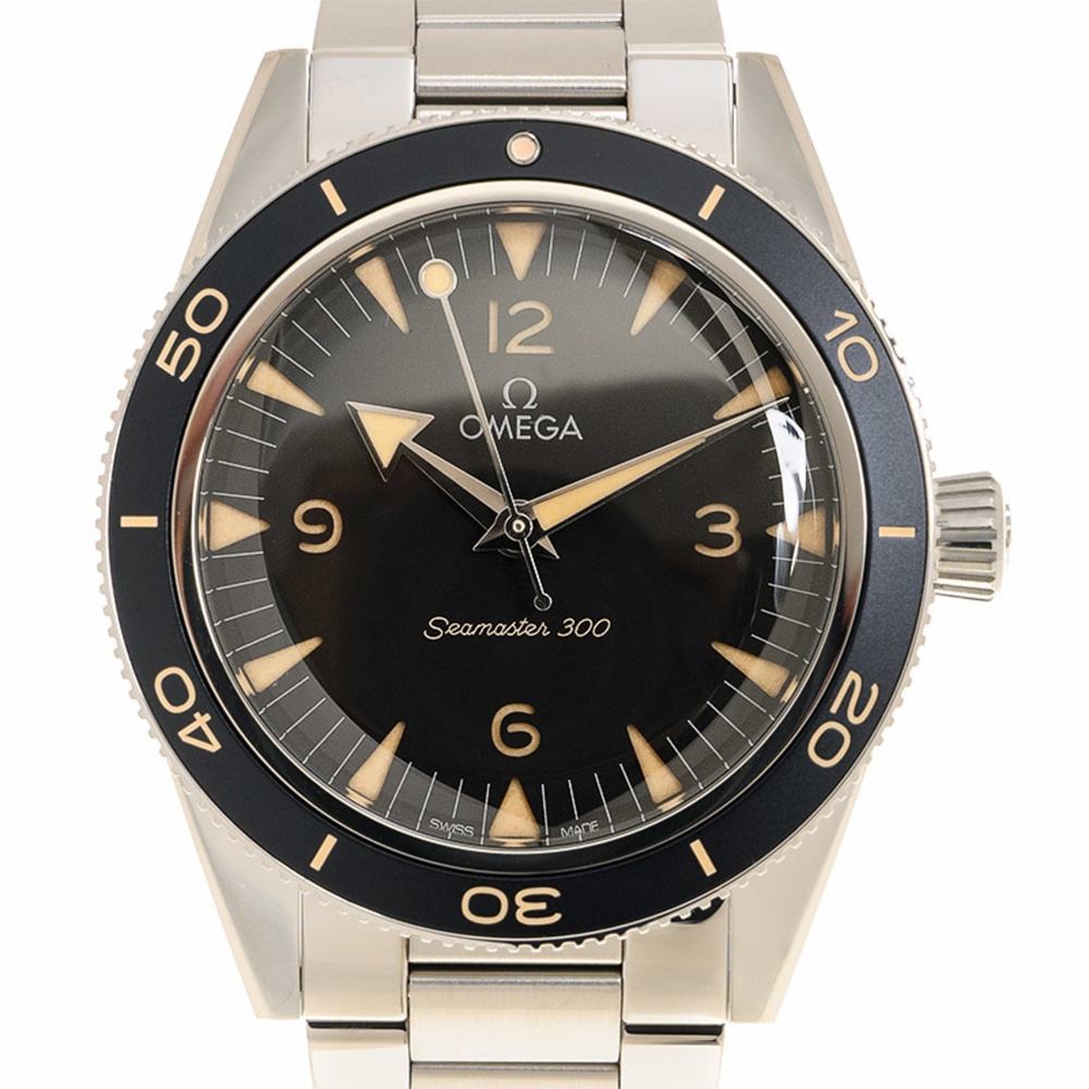 Stainless steel case with a stainless steel bracelet. Uni-directional rotating stainless steel bezel with an inlaid black ceramic ring. Black dial with luminous silver-tone hands and index hour markers. Arabic numerals appear at the 3, 6, 9 and 12 o'clock positions. Minute markers around the outer rim. Dial Type: Analog. Luminescent hands and markers. Omega calibre 8912 automatic movement, containing 39 Jewels, bitting at 25200 vph, and has a power reserve of approximately 60 hours. Scratch resistant sapphire crystal. Screw down crown. Transparent case back. Round case shape. Case size: 41 mm. Band width: 21 mm. Fold over clasp. Water resistant at 300 meters / 1000 feet. Functions: hour, minute, second, co-axial escapement, chronometer. Additional Info: original box, manual (complete accessories). Seamaster Series. Luxury watch style. Watch label: Swiss Made. Omega Seamaster Automatic Chronometer Black Dial Mens Watch 234.30.41.21.01.001.