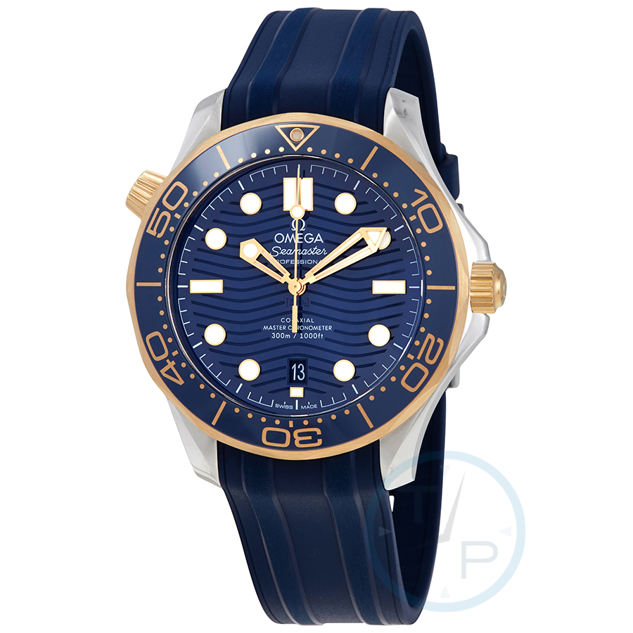 Silver-tone stainless steel case with a blue rubber strap. Uni-directional rotating count-up elapsed time 18kt yellow gold with a blue ceramic ring bezel. Blue ceramic (laser-engraved waves) dial with yellow gold-tone skeleton sword-shaped hands and dot hour markers. Minute markers around the outer rim. Dial Type: Analog. Luminescent hands and markers. Date display at the 6 o'clock position. Omega Calibre 8800 Automatic movement, containing 35 Jewels, bitting at 25200 vph, and has a power reserve of approximately 55 hours. Scratch resistant sapphire crystal. Screw down crown. Transparent case back. Round case shape, case size: 42 mm. Band width: 20 mm. Tang clasp. Water resistant at 300 meters / 1000 feet. Functions: date, hour, minute, second, co-axial escapement, chronometer. Seamaster Series. Dive watch style. Watch label: Swiss Made. Omega Seamaster Automatic Chronometer Steel 18kt Yellow Gold Blue Dial Mens Watch 210.22.42.20.03.001.