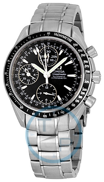 Stainless steel case with a stainless steel bracelet. Fixed black ion-plated bezel with tachymeter. Black dial with luminous hands and stick hour markers. Date scale. Minute markers around the outer rim. Luminescent hands and markers. Date displays on the outer rim of the dial with pointer. Three: 12 hours, GMT, 30 minutes with month and day. Automatic movement. Scratch resistant sapphire crystal. Solid case back. Case diameter: 40 mm. Case thickness: 14.75 mm. Push button deployment clasp. Water resistant at 100 meters / 330 feet. Functions: hours, minutes, seconds, day-date-month, chronograph, tachymeter,. Additional Info: chronograph, tachymeter, luminous hands/markers. Omega Speedmaster Day Date Mens Watch 3220.50.