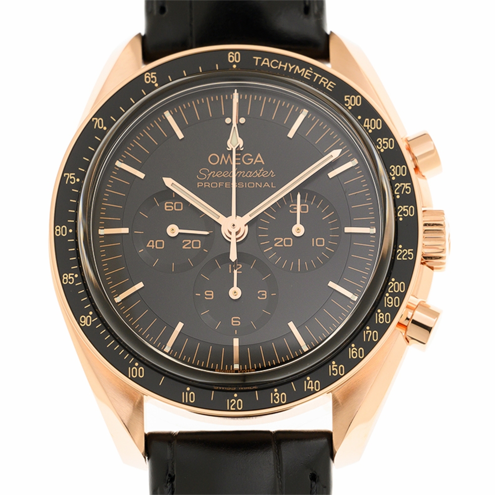 Rose gold-tone 18kt rose gold case with a black alligator band. Fixed tachymeter scale black 18kt rose gold bezel. Black dial with rose gold-tone hands and index hour markers. Minute markers around the outer rim. Dial Type: Analog. Luminescent hands and markers. Chronograph - three sub-dials displaying: 60 second, 30 minute and 12 hour. Omega Calibre 3861 automatic movement. Scratch resistant sapphire crystal. Transparent see through case back. Round case shape, case size: 42 mm. Water resistant at 50 meters / 165 feet. Functions: chronograph, hour, minute, second. Additional Info: original box, international warranty card, manual (complete accessories). Speedmaster Series. Luxury watch style. Watch label: Swiss Made. Omega Speedmaster Chronograph Automatic Black Dial Mens Watch 310.63.42.50.01.001.