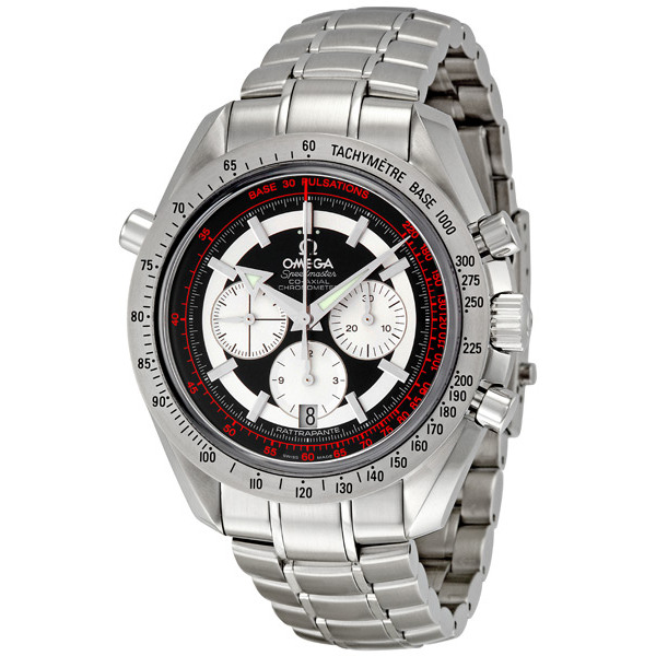 Stainless steel case with a stainless steel bracelet. Fixed stainless steel bezel showing with tachymeter markings. Black dial with luminous hands and index hour markers. Minute markers. Base 30 pulsation scale around the outer rim. Dial Type: Analog. Luminescent hands and markers. Date display appears at the 6 o'clock position. Chronograph - three white sub-dials displaying: 60 second, 30 minute and 12 hour. Self-winding automatic movement. Scratch resistant sapphire crystal. Transparent case back. Case diameter: 44.25 mm. Case thickness: 16.25mm. Round case shape. Deployment clasp. Water resistant at 100 meters (330 feet). Functions: hours, minutes, seconds, calendar, chronograph, tachymeter. Sport watch style. Watch label: Swiss Made. Omega Speedmaster Rattrapante Chronograph Mens Watch 3582.51.00.