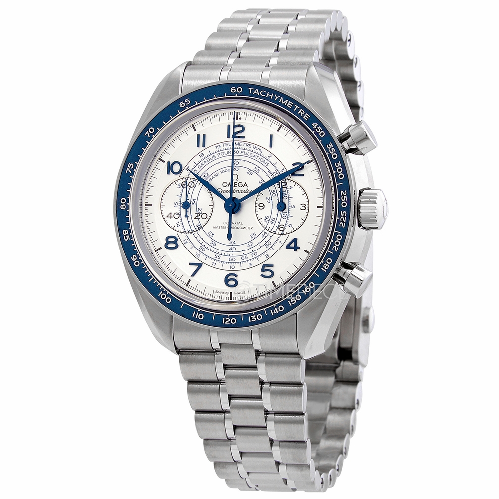 Silver-tone stainless steel case and bracelet. Fixed blue stainless steel bezel. Silver-tone dial with blue hands and Arabic numeral hour markers. Minute markers around the outer rim. Dial Type: Analog. Chronograph - two sub-dials displaying: 60 second and 12 hour. Omega Calibre 9908 automatic movement. Scratch resistant sapphire crystal. Screw down crown. Transparent see through case back. Round case shape, case size: 43 mm. Fold over clasp. Water resistant at 50 meters / 165 feet. Functions: chronograph, hour, minute, second. Additional Info: original box, international warranty card, manual (complete accessories). Speedmaster Series. Luxury watch style. Watch label: Swiss Made. Omega Speedmaster Chronograph Automatic Silver Dial Mens Watch 329.30.43.51.02.001.