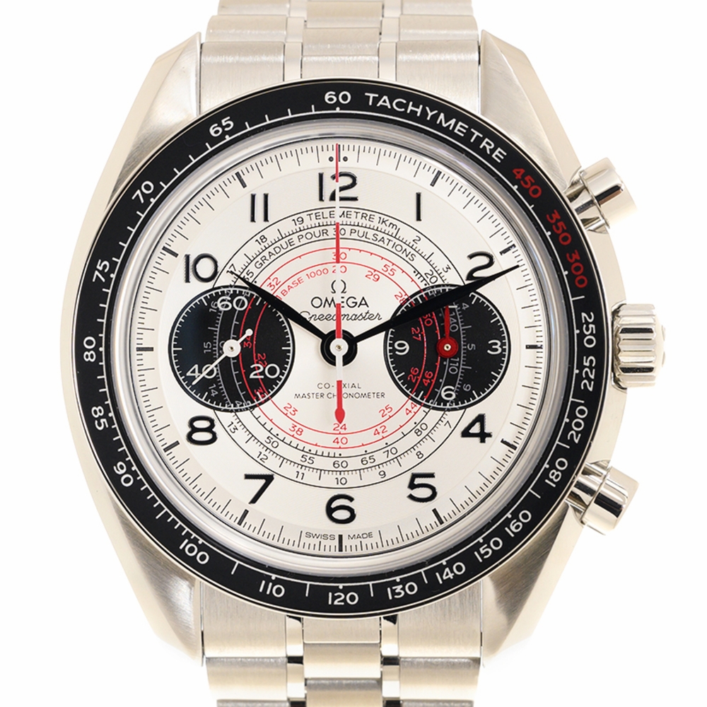 Silver-tone stainless steel case and bracelet. Fixed tachymeter scale black stainless steel bezel. Silver-tone dial with black hands and Arabic numeral hour markers. Minute markers around the outer rim. Dial Type: Analog. Chronograph - two sub-dials displaying: 60 second and 12 hour. Omega Calibre 9908 hand wind movement. Scratch resistant sapphire crystal. Screw down crown. Transparent see through case back. Round case shape, case size: 43 mm. Fold over clasp. Water resistant at 50 meters / 165 feet. Functions: chronograph, hour, minute, second. Additional Info: original box, international warranty card, manual (complete accessories). Speedmaster Series. Luxury watch style. Watch label: Swiss Made. Omega Speedmaster Chronograph Hand Wind Silver Dial Mens Watch 329.30.43.51.02.002.