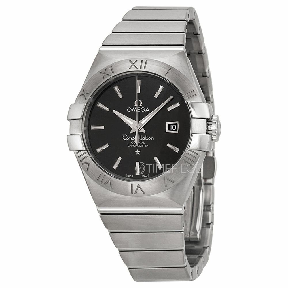 Stainless steel case with a stainless steel bracelet. Fixed stainless steel bezel. Black dial with silver-toned hands and index hour markers. Dial Type: Analog. Date display at the 3 o'clock position. Automatic movement with 50 hour power reserve. Scratch resistant sapphire crystal. Case diameter: 31 mm. Round case shape. Push button fold over clasp. Water resistant at 100 meters / 330 feet. Functions: date, hour, minute, second. Luxury watch style. Watch label: Swiss Made. Omega Constellation Black Dial Stainless Steel Diamond Automatic Ladies Watch 123.10.31.20.01.001.