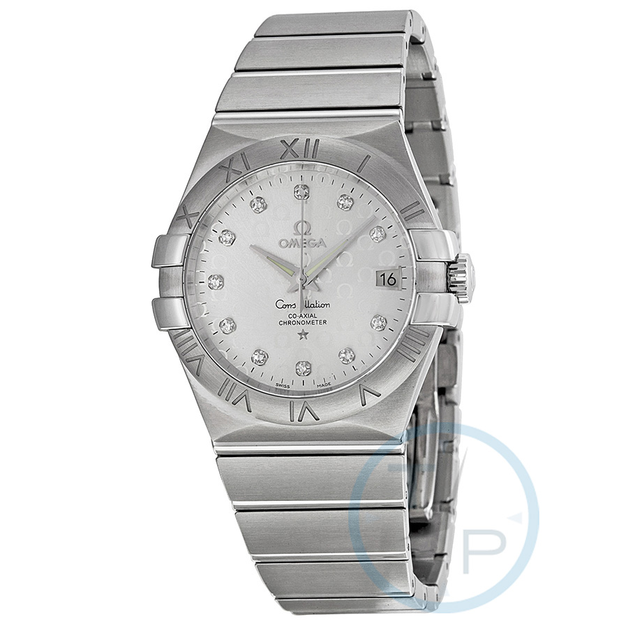 Silver-tone stainless steel case with a silver-tone stainless steel bracelet. Fixed silver-tone stainless steel bezel. Silver dial with silver-toned hands and diamond hour markers. Minute markers around the outer rim. Dial Type: Analog. Date display at the 3 o'clock position. Omega Calibre 2500 Automatic movement, based upon ETA 2892-A2, containing 27 Jewels, bitting at 25200 vph, and has a power reserve of approximately 48 hours. Scratch resistant sapphire crystal. Pull / push crown. Skeleton case back. Round case shape, case size: 35 mm, case thickness: 11 mm. Band width: 21.6 mm, band length: 8.5 inches. Deployment clasp. Water resistant at 100 meters / 330 feet. Functions: date, hour, minute, second, co-axial escapement, chronometer. Luxury watch style. Watch label: Swiss Made. Item Variations: 123 10 35 20 52 002, 123-10-35-20-52-002, 123/10/35/20/52/002, 12310352052002. Omega Constellation Silver Diamond Dial Stainless Steel Mens Watch 123.10.35.20.52.002.