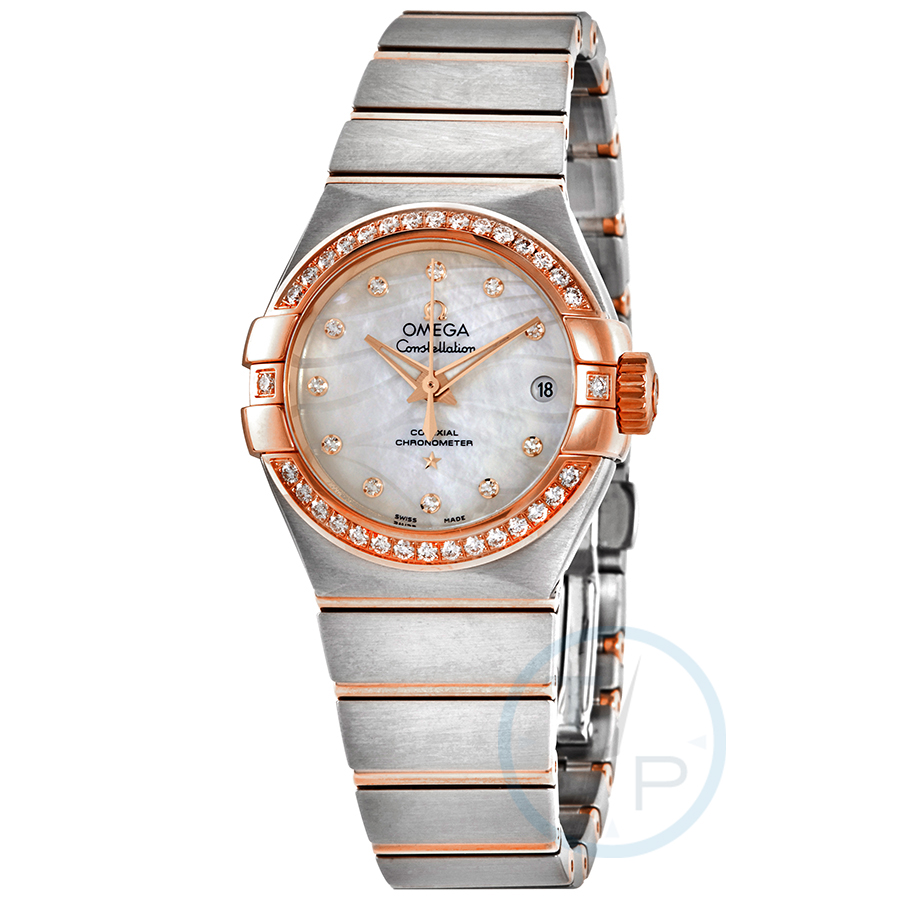 Stainless steel case with a stainless steel with 18kt rose gold bracelet. Diamonds bezel. White moth-of-pearl dial with rose gold-tone hands and diamonds hour markers. Dial Type: Analog. Luminescent hands. Date display at the 3 o'clock position. Omega Calibre 8520 automatic movement with a 50-hour power reserve. Scratch resistant sapphire crystal. Pull / push crown. Skeleton transparent exhibition see through case back. Round case shape. Case size: 27 mm. Fold over with push button release clasp. Water resistant at 100 meters / 330 feet. Functions: date, hour, minute, second, chronometer. Luxury watch style. Watch label: Swiss Made. Item Variations: 123 25 27 20 55 005, 123-25-27-20-55-005, 123/25/27/20/55/005, 12325272055005. Omega Constellation Co-Axial White Moth-of-Pearl Dial 27 mm Ladies Watch 123.25.27.20.55.005.