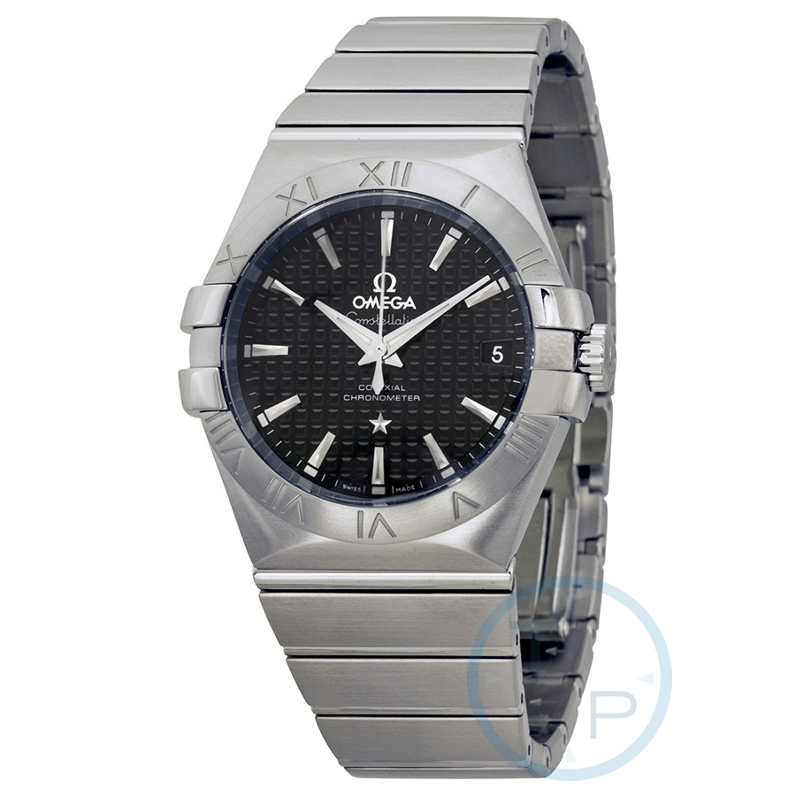 Stainless steel case with a stainless steel bracelet. Fixed stainless steel bezel. Black dial with luminous silver-tone hands and stick hour markers. Minute markers around the outer rim. Dial Type: Analog. Luminescent hands and markers. Date display at the 3 o'clock position. Automatic movement with a 48 hour power reserve. Scratch resistant sapphire crystal. Pull / push crown. Skeleton case back. Case diameter: 35 mm. Case thickness: 11 mm. Round case shape. Band width: 23 mm. Band length: 8.5 inches. Deployment clasp with push button release. Water resistant at 100 meters / 330 feet. Functions: date, hour, minute, second. Luxury watch style. Watch label: Swiss Made. Omega Constellation Chronometer Automatic Black Dial Ladies Watch 123.10.35.20.01.002.