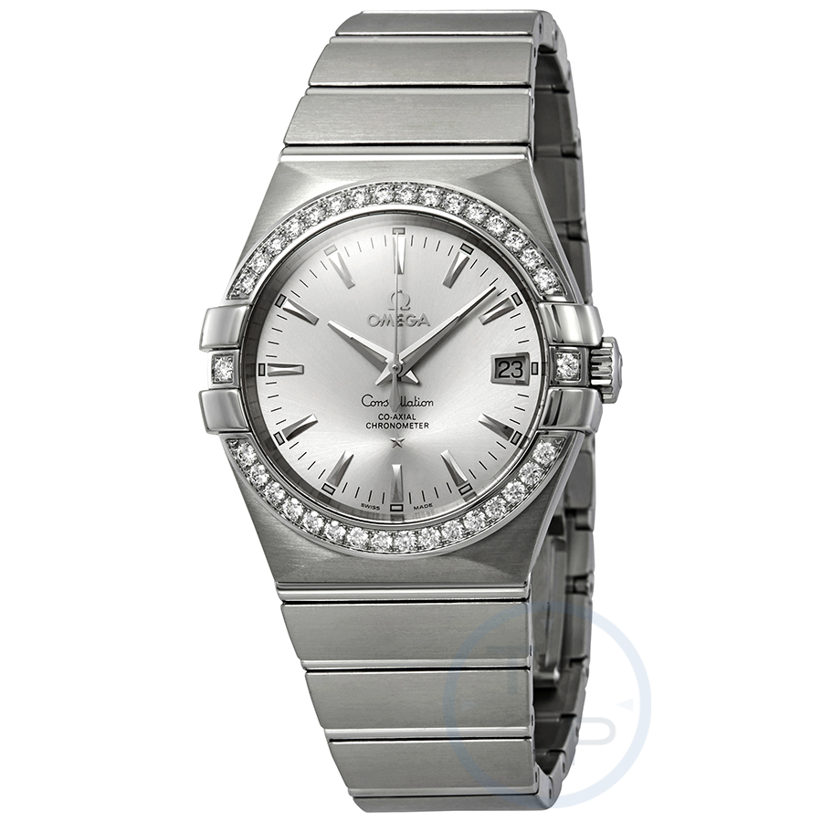 Stainless steel case with a stainless steel bracelet. Fixed stainless steel bezel set with 34 diamonds bezel. Silver dial with luminous silver-tone dauphine-style hands and index hour markers. Minute markers around the outer rim. Dial Type: Analog. Luminescent hands and markers. Date display at the 3 o'clock position. Omega calibre 2500 automatic movement, based upon ETA 2892-A2, containing 27 Jewels, bitting at 25200 vph, and has a power reserve of approximately 48 hours. Scratch resistant sapphire crystal. Pull / push crown. Transparent case back. Round case shape. Case size: 35 mm. Case thickness: 10 mm. Band width: 23 mm. Fold over clasp with a push button release. Water resistant at 100 meters / 330 feet. Functions: date, hour, minute, second, co-axial escapement, chronometer. Dress watch style. Watch label: Swiss Made. Omega Constellation Automatic Chronometer Diamond Ladies Watch 123.15.35.20.02.001.