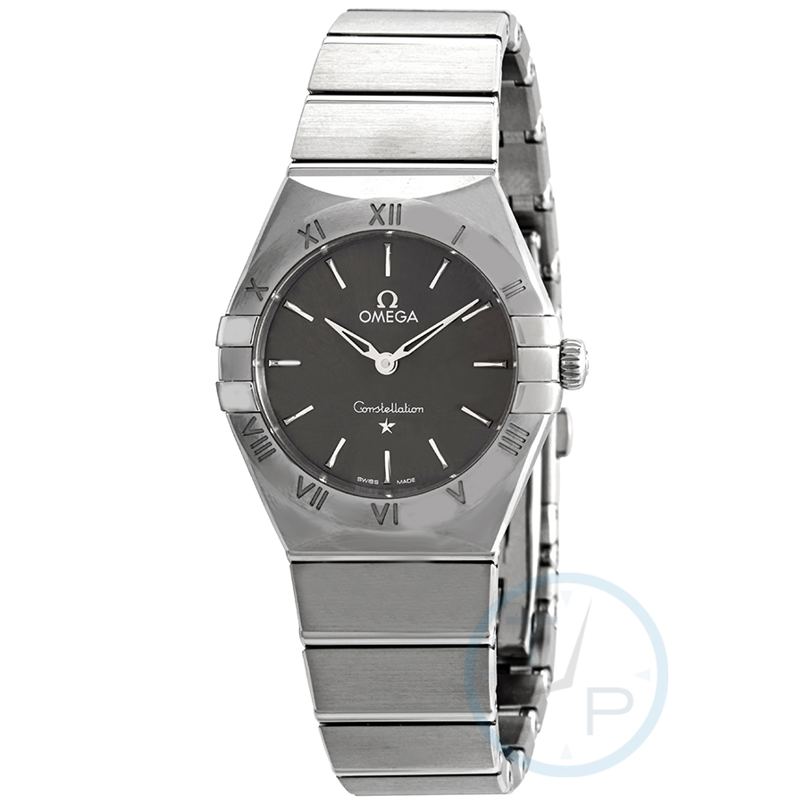 Stainless steel case with a stainless steel bracelet. Fixed stainless steel bezel. Grey dial with 18kt white gold hands and 18kt white gold index hour markers. Dial Type: Analog. Omega calibre 4061 quartz movement. Scratch resistant sapphire crystal. Pull / push crown. Solid case back. Round case shape. Case size: 28 mm. Band width: 17.5 mm. Fold over clasp with a push button release. Water resistant at 30 meters / 100 feet. Functions: hour, minute. Luxury watch style. Watch label: Swiss Made. Omega Constellation Manhattan Quartz Grey Dial Ladies Watch 131.10.28.60.06.001.