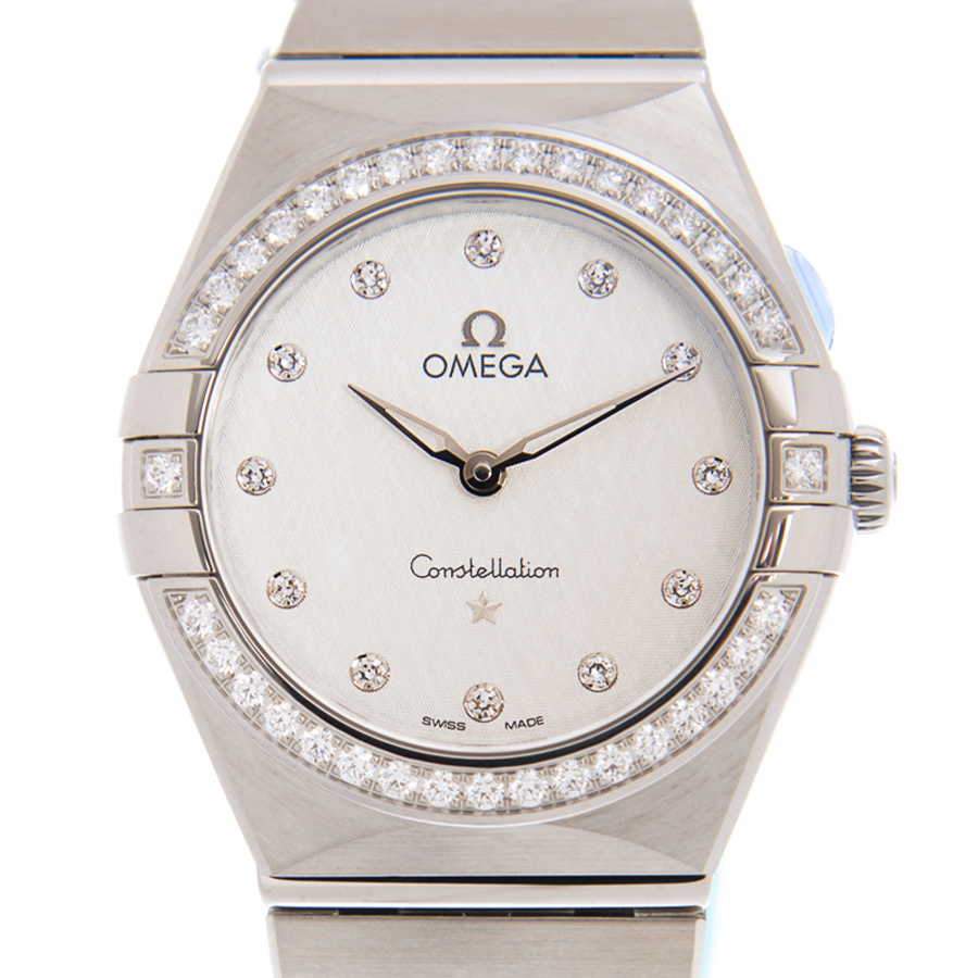 Stainless steel case with a stainless steel bracelet. Fixed stainless steel bezel set with diamonds. Silver dial with luminous silver-tone hands and diamond hour markers. Dial Type: Analog. Omega calibre 4061 quartz movement. Scratch resistant sapphire crystal. Pull / push crown. Solid case back. Round case shape. Case size: 28 mm. Band width: 17.5 mm. Fold over with push button release clasp. Water resistant at 30 meters / 100 feet. Functions: hour, minute. Luxury watch style. Watch label: Swiss Made. Omega Constellation Manhattan Quartz Diamond Silver Dial Ladies Watch 131.15.28.60.52.001.