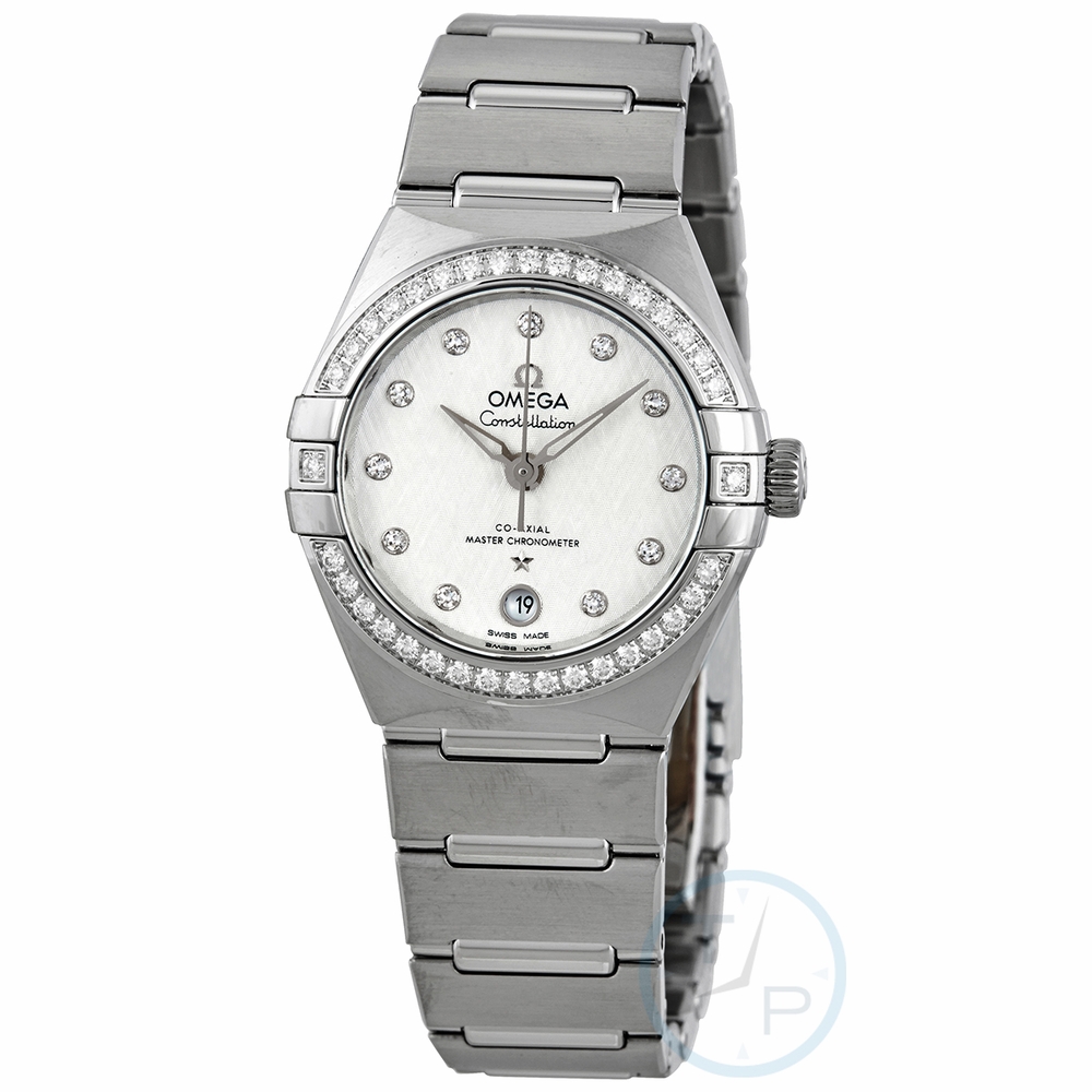 Stainless steel case with a stainless steel bracelet. Fixed bezel. Silver dial with silver-tone hands and diamond hour markers. Dial Type: Analog. Date display at the 6 o'clock position. Omega Calibre 8700 automatic movement. Scratch resistant sapphire crystal. Pull / push crown. Transparent case back. Round case shape. Case size: 29 mm. Push button folding clasp. Water resistant at 50 meters / 165 feet. Functions: date, hour, minute, co-axial escapement. Dress watch style. Watch label: Swiss Made. Omega Constellation Automatic Diamond Silver Dial Ladies Watch 131.15.29.20.52.001.