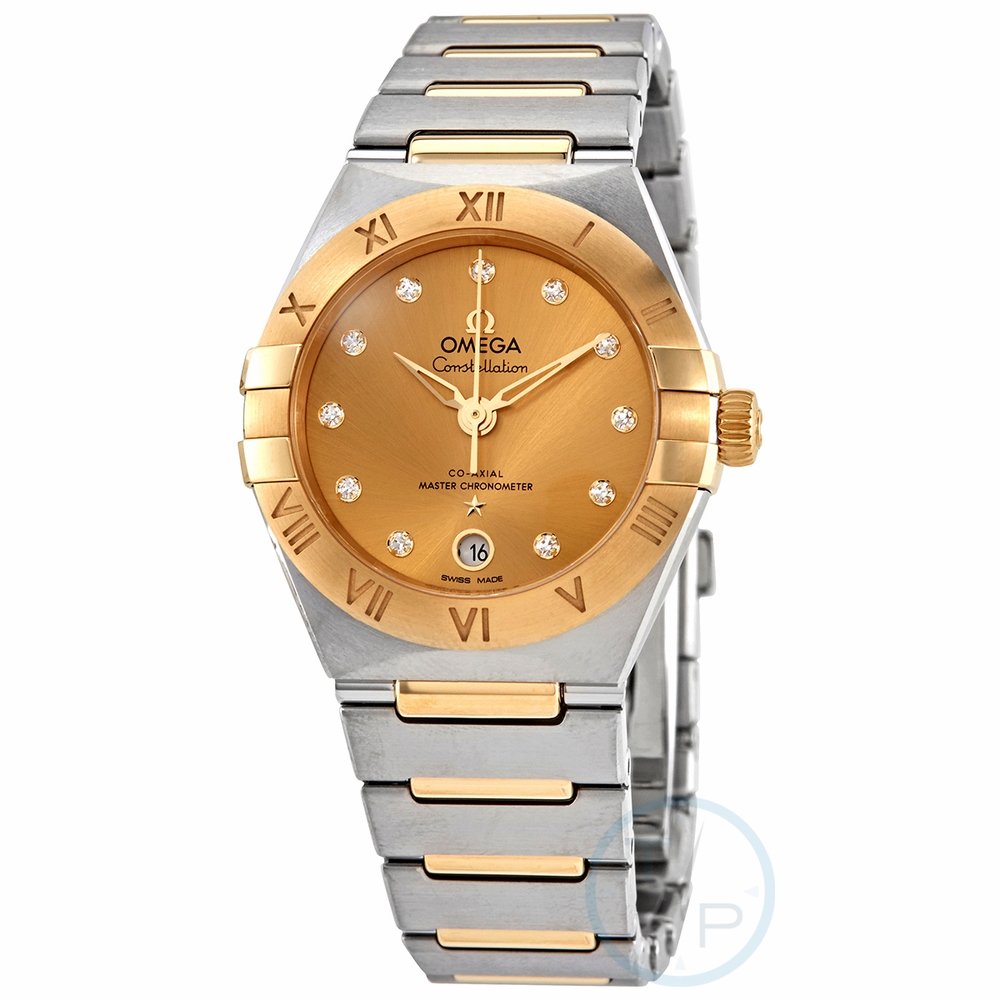 Silver-tone stainless steel case with a two-tone (silver-tone and gold-tone) stainless steel with 18kt yellow gold accents bracelet. Fixed 18kt yellow gold bezel. Yellow dial with 18kt yellow gold skeleton alpha-style hands and diamond hour markers. Dial Type: Analog. Date display 6 o'clock position. Omega Calibre 8700 automatic movement with a 50-hour power reserve. Scratch resistant sapphire crystal. Pull / push crown. Transparent case back. Round case shape, case size: 29 mm. Band width: 17.6 mm. Hidden clasp. Water resistant at 50 meters / 165 feet. Functions: date, hour, minute, chronometer. Constellation Manhattan Series. Dress watch style. Watch label: Swiss Made. Omega Constellation Manhattan Automatic Diamond Ladies Watch 131.20.29.20.58.001.