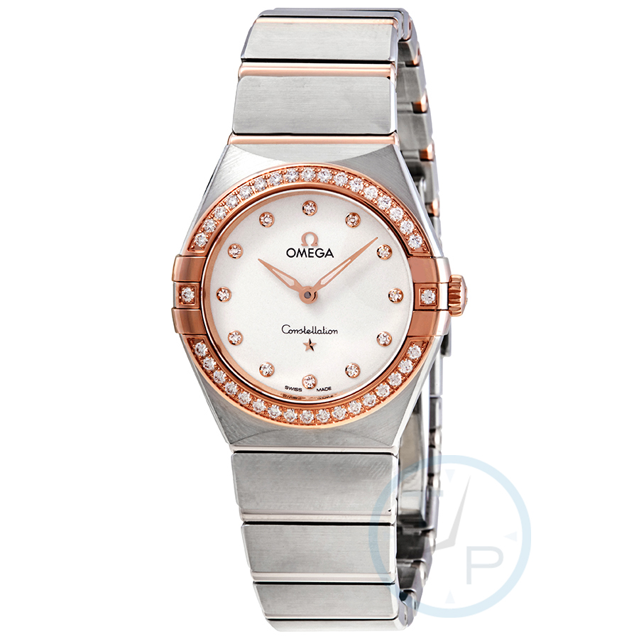 Silver-tone stainless steel case with a stainless steel and 18kt sedna gold bracelet. Fixed 18k sedna gold diamond set bezel. Silver dial with rose gold hands and diamond hour markers. Dial Type: Analog. Omega Calibre 4061 quartz movement. Scratch resistant sapphire crystal. Solid case back. Round case shape. Case size: 28 mm. Band width: 17.5 mm. Water resistant at 30 meters / 100 feet. Functions: hour, minute. Dress watch style. Watch label: Swiss Made. Omega Constellation Manhattan Quartz Diamond Silver Dial Ladies Watch 131.25.28.60.52.001.