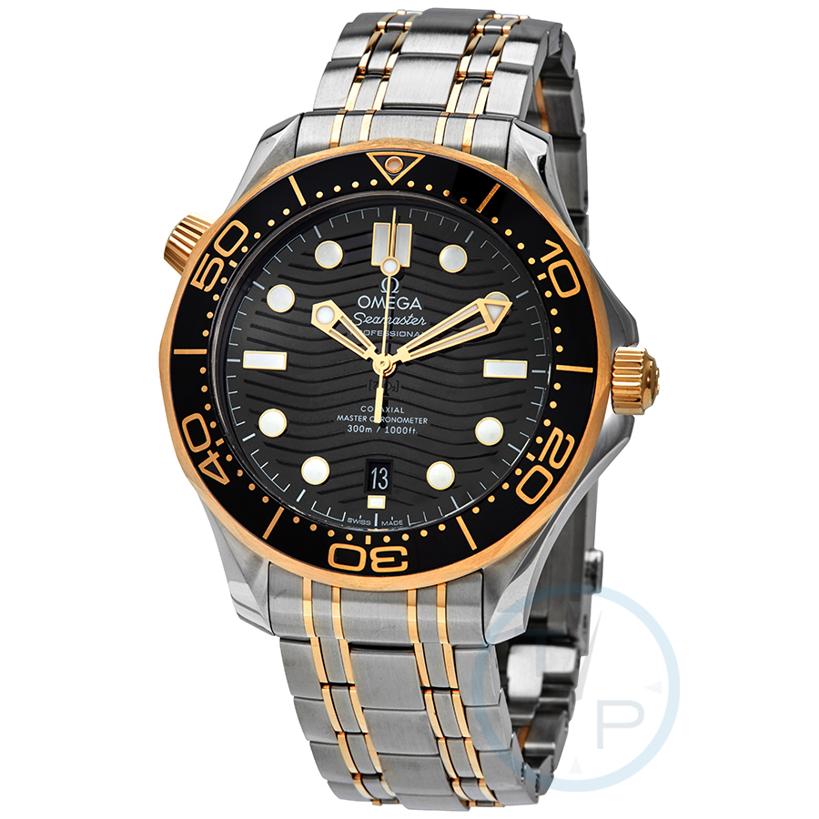 Stainless steel case with a stainless steel bracelet with 18kt yellow gold links. Uni-directional rotating 18kt yellow gold bezel with a black ceramic ring. Black dial with yellow gold skeleton hands and dot hour markers. Minute markers around the outer rim. Dial Type: Analog. Luminescent hands and markers. Date display 6 o'clock position. Omega calibre 8800 automatic movement, containing 35 Jewels, bitting at 25200 vph, and has a power reserve of approximately 55 hours. Scratch resistant sapphire crystal. Screw down crown. Transparent case back. Round case shape. Case size: 42 mm. Band width: 20 mm. Deployment clasp with a push button release. Water resistant at 300 meters / 1000 feet. Functions: date, hour, minute, second, chronometer. Diver 300m Series. Dive watch style. Watch label: Swiss Made. Omega Diver 300M Automatic Chronometer Black Dial Mens Watch 210.20.42.20.01.002.