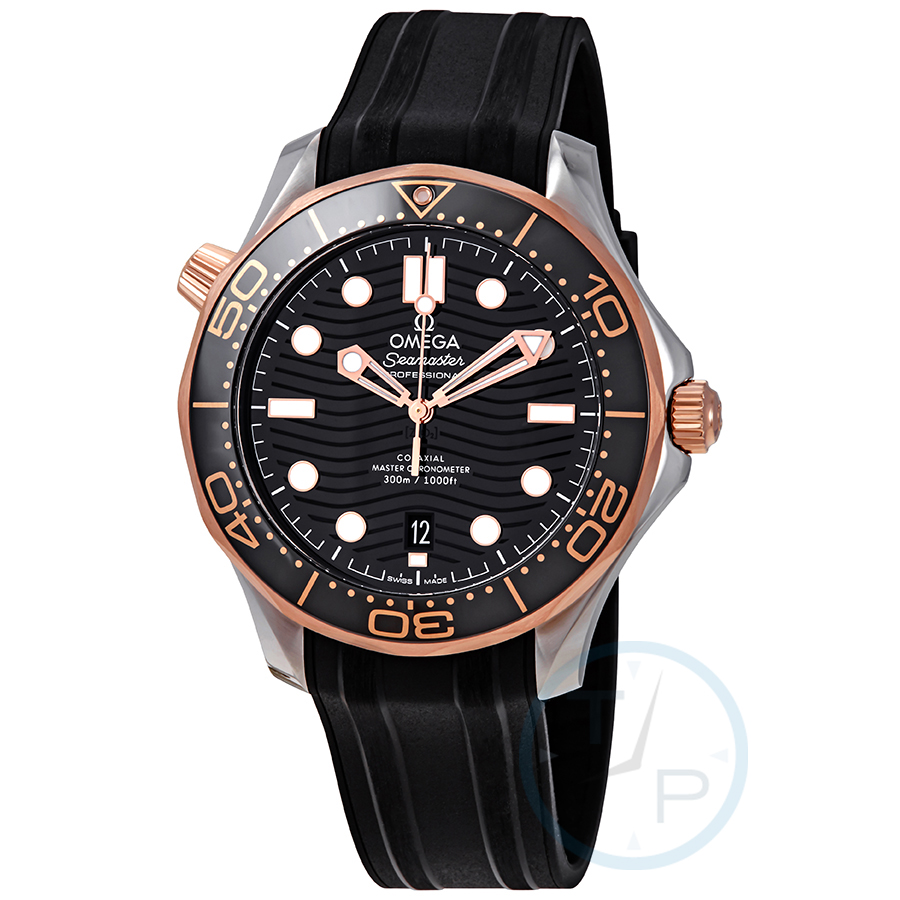 Stainless steel case with a black rubber strap. Uni-directional rotating 18kt sedna gold bezel with a black ceramic (count-up elapsed time) ring. Black dial with luminous rose gold-tone skeleton hands and dot hour markers. Minute markers around the outer rim. Dial Type: Analog. Luminescent hands and markers. Date display at the 6 o'clock position. Omega calibre 8800 automatic movement, containing 35 Jewels, bitting at 25200 vph, and has a power reserve of approximately 55 hours. Scratch resistant sapphire crystal. Screw down crown. Transparent case back. Round case shape. Case size: 42 mm. Case thickness: 11 mm. Band width: 20 mm. Tang clasp. Water resistant at 300 meters / 1000 feet. Functions: date, hour, minute, second. Seamaster Series. Dive watch style. Watch label: Swiss Made. Omega Seamaster Automatic Steel 18kt Sedna Gold Black Dial Mens Watch 210.22.42.20.01.002.