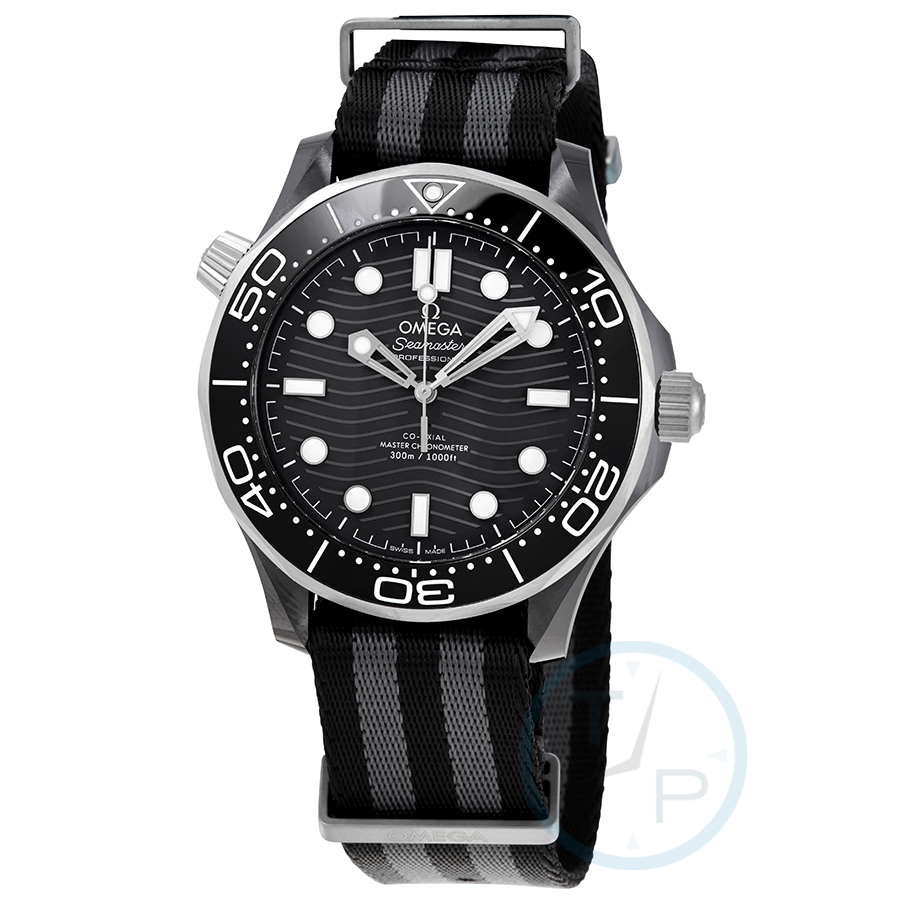 Black ceramic case with a black and grey canvas strap. Uni-directional rotating titanium bezel with a black ceramic ring. Black dial with luminous silver-tone hands and dot hour markers. Minute markers around the outer rim. Dial Type: Analog. Luminescent hands and markers. Omega calibre 8806 automatic movement with a 55-hour power reserve. Scratch resistant sapphire crystal. Screw down crown. Transparent case back. Round case shape. Case size: 43.5 mm. Band width: 21 mm. Tang clasp. Water resistant at 300 meters / 1000 feet. Functions: hour, minute, second, co-axial escapement, chronometer, magnetic resistant. Dive watch style. Watch label: Swiss Made. Omega Seamaster Automatic Chronometer Mens Watch 210.92.44.20.01.002.