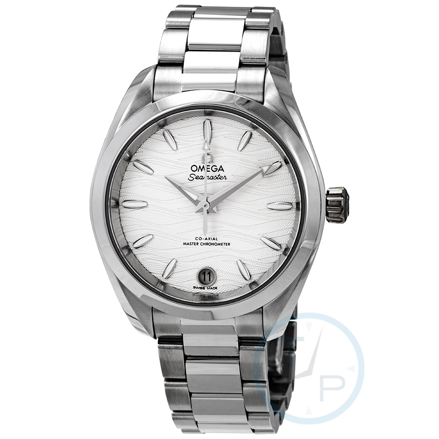 Silver-tone stainless steel case with a silver-tone stainless steel bracelet. Fixed silver-tone stainless steel bezel. Waved opaline silvery dial with luminous rhodium-plated arrow-shaped hands and 18kt white gold index hour markers. Dial Type: Analog. Luminescent hands and markers. Date display at the 6 o'clock position. Omega Calibre 8800 Automatic movement, containing 35 Jewels, bitting at 25200 vph, and has a power reserve of approximately 55 hours. Scratch resistant sapphire crystal. Pull / push crown. Transparent case back. Round case shape, case size: 34 mm. Band width: 16 mm. Fold over with push button release clasp. Water resistant at 150 meters / 500 feet. Functions: date, hour, minute, second. Seamaster Aqua Terra Series. Luxury watch style. Watch label: Swiss Made. Omega Seamaster Aqua Terra Waved Opaline Silvery Dial Automatic Ladies Watch 220.10.34.20.02.002.