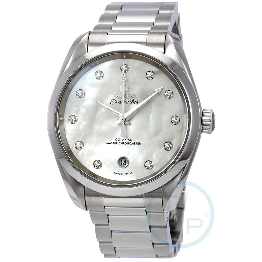 Stainless steel case with a stainless steel bracelet. Fixed stainless steel bezel. White mother of pearl dial with luminous silver-tone hands and diamond hour markers. Dial Type: Analog. Luminescent hands. Date display at the 6 o'clock position. Omega calibre 8800 automatic movement with a 55-hour power reserve. Scratch resistant sapphire crystal. Screw down crown. Transparent case back. Round case shape. Case size: 38 mm. Band width: 19 mm. Fold over clasp with a push button release. Water resistant at 150 meters / 500 feet. Functions: date, hour, minute, second, co-axial escapement, chronometer. Luxury watch style. Watch label: Swiss Made. Omega Seamaster Aqua Terra Automatic Chronometer Diamond Ladies Watch 220.10.38.20.55.001.