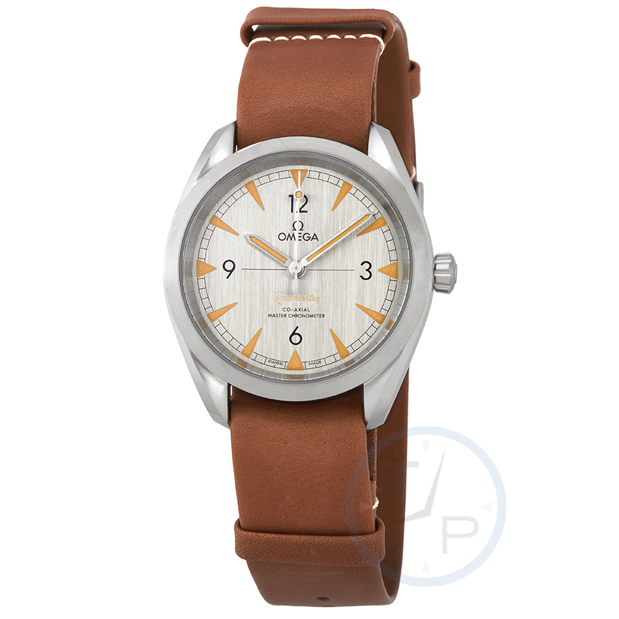 Stainless steel case with a brown leather (NATO) strap. Fixed stainless steel bezel. Brushed grey dial with orange silver-tone hands and index hour markers. Arabic numerals mark the 3, 6, 9 and 12 o'clock positions. Minute markers around the outer rim. Dial Type: Analog. Luminescent hands and markers. Omega calibre 8806 automatic movement with a 55-hour power reserve. Scratch resistant sapphire crystal. Screw down crown. Solid case back. Round case shape. Case size: 40 mm. Band width: 20 mm. Tang clasp. Water resistant at 150 meters / 500 feet. Functions: hour, minute, second. Dive watch style. Watch label: Swiss Made. Omega Seamaster Railmaster Brushed Grey Dial Automatic Mens Watch 220.12.40.20.06.001.