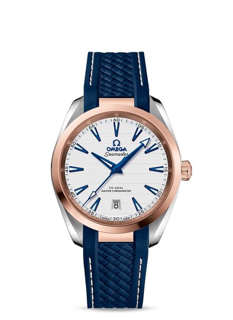Stainless steel case with a blue rubber strap. Fixed smooth 18kt sedna gold bezel. Teak silver dial with luminous blue arrow-shaped hands and index hour markers. Arabic numeral minute markers (at 5 minute intervals). Minute markers around the inner rim. Dial Type: Analog. Luminescent hands and markers. Date display at the 6 o'clock position. Omega calibre 8800 automatic movement, containing 35 Jewels, bitting at 25200 vph, and has a power reserve of approximately 55 hours. Scratch resistant sapphire crystal. Screw down crown. Transparent case back. Round case shape. Case size: 38 mm. Fold over clasp. Water resistant at 150 meters/500 feet. Functions: date, hour, minute, second, co-axial escapement, chronometer, magnetic resistant. Seamaster Aqua Terra Series. Luxury watch style. Watch label: Swiss Made. Omega Seamaster Aqua Terra Automatic Teak Silver Dial Mens Watch 220.22.38.20.02.001.