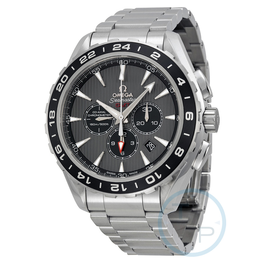 Stainless steel case with a stainless steel bracelet. Bi-directional rotating stainless steel bezel with a dark grey ceramic top ring. Grey dial with luminous silver-tone hands and index hour markers. Minute markers around the outer rim. Dial Type: Analog. Luminescent hands and markers. Date display between 4 and 5 o'clock position. Chronograph - three sub-dials displaying: 60 second, 30 minute and 12-hour. Omega calibre 3603 automatic movement with a 52-hour power reserve. Scratch resistant sapphire crystal. Screw down crown. Transparent case back. Round case shape. Case size: 44 mm. Band width: 24.1 mm. Band length: 9.5 inches. Deployment clasp with a push button release. Water resistant at 150 meters / 500 feet. Functions: chronograph, GMT, second time zone, date, hour, minute, second, chronometer. Luxury watch style. Watch label: Swiss Made. Item Variations: 231 10 44 52 06 001, 231-10-44-52-06-001, 231/10/44/52/06/001, 23110445206001. Omega Sea Master Aqua Terra Chronograph GMT Grey Dial Mens Watch 23110445206001.