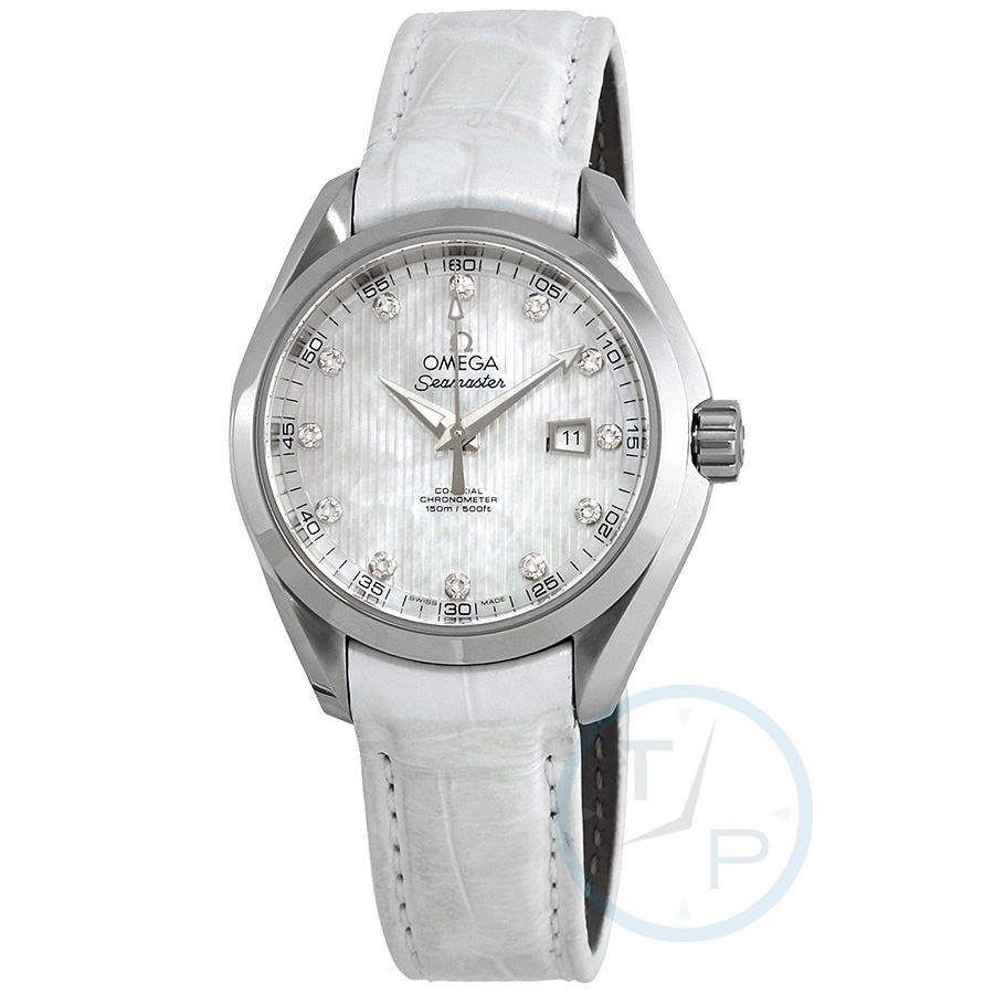 Silver-tone stainless steel case with a white leather strap. Fixed silver-tone stainless steel bezel. White dial with luminous silver-tone hands and diamond hour markers. Minute markers around the outer rim. Dial Type: Analog. Date display at the 3 o'clock position. Omega Calibre 8520 automatic movement with a 50-hour power reserve. Scratch resistant sapphire crystal. Screw down crown. Transparent case back. Round case shape. Case size: 34 mm. Water resistant at 150 meters / 500 feet. Functions: date, hour, minute, second, co-axial escapement, chronometer. Luxury watch style. Watch label: Swiss Made. Omega Seamaster Aqua Terra Automatic Chronometer Diamond White Dial Ladies Watch 231.13.34.20.55.001.