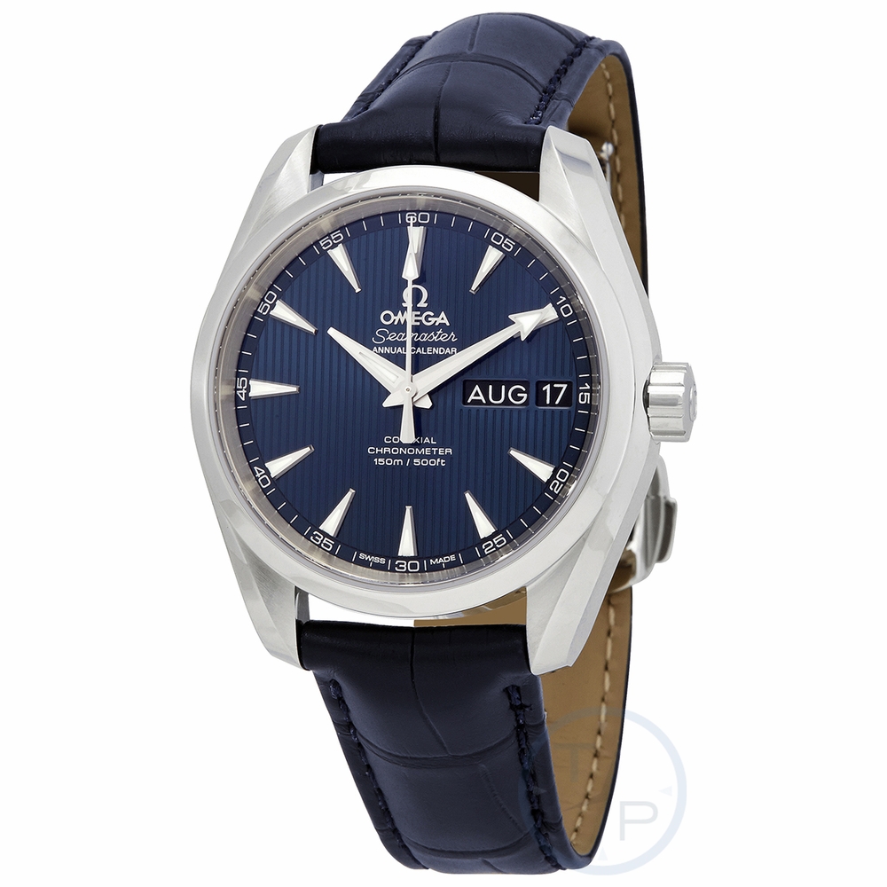 Stainless steel case with a blue (alligator) leather strap. Fixed stainless steel bezel. Blue (teak concept) dial with silver-tone arrow-shaped hands and index hour markers. Minute markers around the outer rim. Dial Type: Analog. Luminescent hands and markers. Month and date display at the 3 o'clock position. Omega calibre 8601 automatic movement, based upon Omega 8500, containing 39 Jewels, bitting at 25200 vph, and has a power reserve of approximately 55 hours. Scratch resistant sapphire crystal. Screw down crown. Transparent case back. Round case shape. Case size: 38.5 mm. Case thickness: 14.7 mm. Band width: 19 mm. Deployment clasp. Water resistant at 150 meters / 500 feet. Functions: annual calendar, month, date, hour, minute, second, chronometer. Luxury watch style. Watch label: Swiss Made. Item Variations: 231 13 39 22 03 001, 231-13-39-22-03-001, 231/13/39/22/03/001, 23113392203001. Omega Aqua Terra Annual Calendar Blue Dial Mens Watch 231.13.39.22.03.001.
