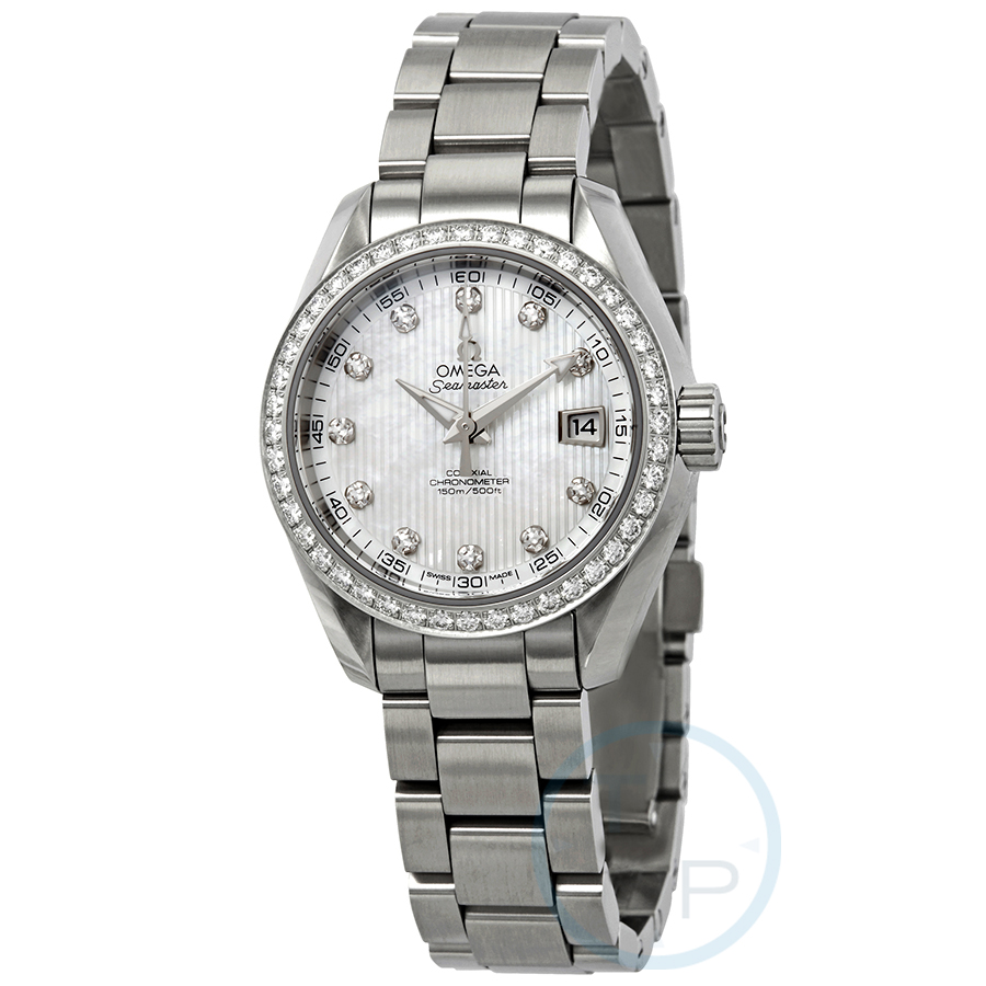 Silver-tone stainless steel case with a silver-tone stainless steel bracelet. Fixed silver-tone stainless steel set with diamonds bezel. Mother of pearl dial with luminous silver-tone hands and diamond hour markers. Minute markers around the outer rim. Dial Type: Analog. Luminescent hands. Date display at the 3 o'clock position. Omega Calibre 8520 automatic movement with a 50-hour power reserve. Scratch resistant sapphire crystal. Screw down crown. Transparent case back. Round case shape. Case size: 30 mm. Band width: 14 mm. Water resistant at 150 meters / 500 feet. Functions: date, hour, minute, second, co-axial escapement, chronometer. Dress watch style. Watch label: Swiss Made. Omega Seamaster Aqua Terra Mother of Pearl Diamond Dial Automatic Ladies Watch 231.15.30.20.55.001.