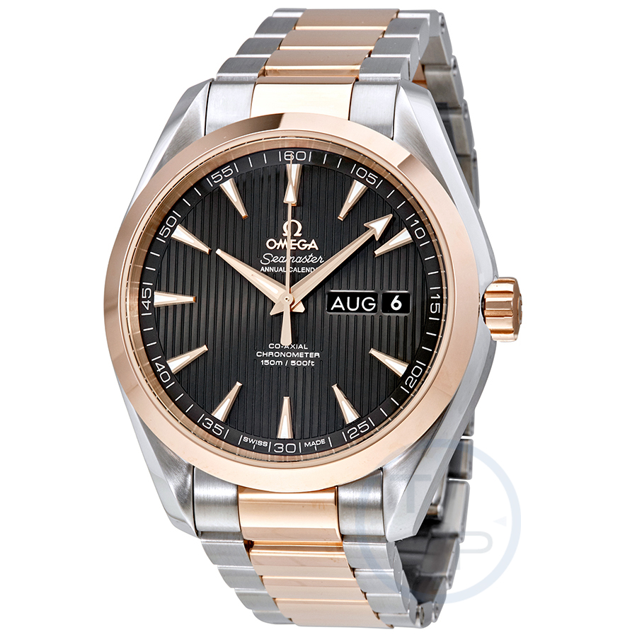 Stainless steel case with a stainless steel bracelet with 18kt rose gold center links. Fixed 18kt rose gold bezel. Teak grey dial with luminous rose gold-tone hands and index hour markers. Minute markers around the outer rim. Dial Type: Analog. Luminescent hands and markers. Day of the week and date display at the 3 o'clock position. Omega calibre 8601 automatic movement with a 55-hour power reserve. Scratch resistant sapphire crystal. Screw down crown. Transparent case back. Case size: 43 mm. Case thickness: 15.5 mm. Round case shape. Band width: 21 mm. Deployment clasp. Water resistant at 150 meters / 500 feet. Functions: annual calendar, month, date, hour, minute, second, chronometer. Luxury watch style. Watch label: Swiss Made. Omega Seamaster Aqua Terra Teak Annual Calendar Automatic Grey Dial Mens Watch 23120432206002.