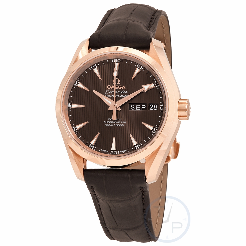 18kt rose gold case with a brown leather strap. Fixed 18kt rose gold bezel. Grey dial with gold-tone arrow-shaped hands and index hour markers. Minute markers around the inner rim. Dial Type: Analog. Luminescent hands and markers. Month and date display at the 3 o'clock position. Omega Calibre 8611 Automatic movement, based upon Omega 8601, containing 39 Jewels, bitting at 25200 vph, and has a power reserve of approximately 60 hours. Scratch resistant sapphire crystal. Screw down crown. Skeleton case back. Round case shape. Case size: 38.5 mm. Band width: 19 mm. Deployment clasp. Water resistant at 150 meters / 500 feet. Functions: annual calendar, month, date, hour, minute, second, co-axial escapement, chronometer. Luxury watch style. Watch label: Swiss Made. Omega Seamaster Aqua Terra 18kt Rose Gold Annual Calendar Watch 231.53.39.22.06.001.